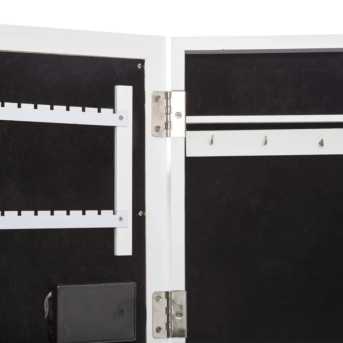 Haute de 36 cm pour une largeur de 26,5 cm, cette armoire à bijoux led est composée d’une structure en fibres de bois. Montée sur un pied au centre duquel elle peut pivoter, elle contient plusieurs séries de crochets pour trier bagues, colliers et boucles d’oreilles. Le miroir de la porte extérieure s’éclaire grâce des LED qui fonctionnent avec des piles.