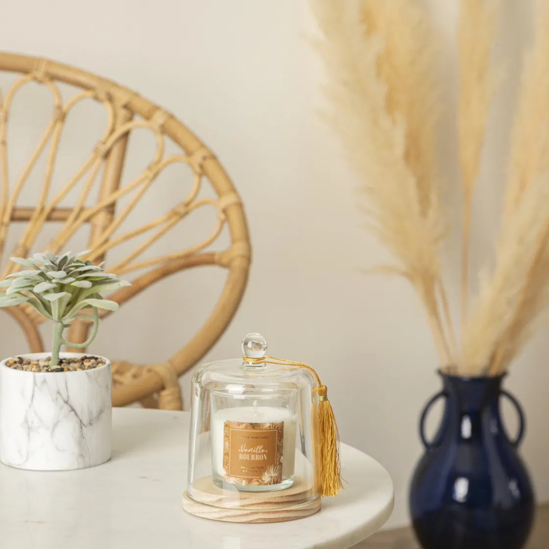 Une fois la bougie parfumée « Loli » terminée, vous pourrez disposer une statuette ou des fleurs séchées sous le globe.