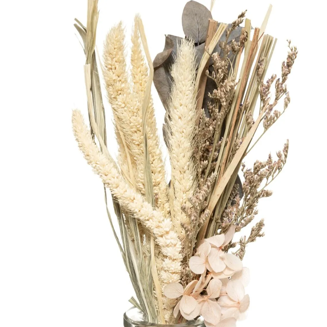 Nul besoin d’un entretien fastidieux, cet ensemble de plantes séchées embellit l’espace en un clin d’oeil. Il vous plaira par sa variation de textures et de couleurs. Le bouquet est présenté dans un vase en verre rainuré pour une touche campagne chic.