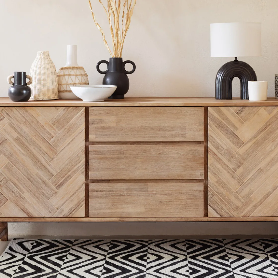Ce buffet se distingue par son fini à chevrons et ses pieds originaux. Il se mariera idéalement avec des matières naturelles et des objets rapportés de vos voyages. Créez un ensemble exotique en l’accessoirisant avec un vase en terre cuite, des statuettes et des bougies.