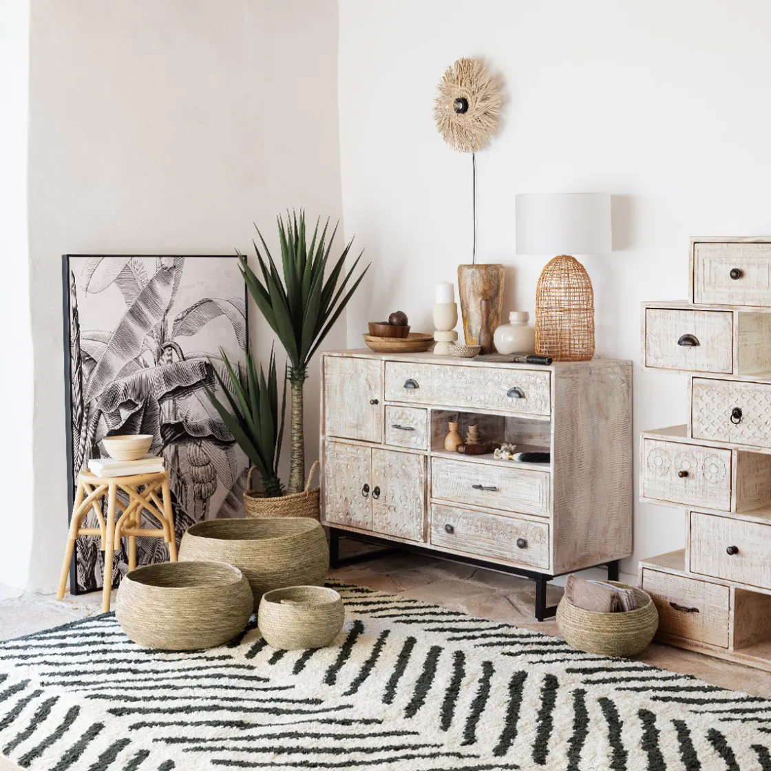 Ce joli bahut sculpté à la main et patiné en Inde, multiplie les rangements.