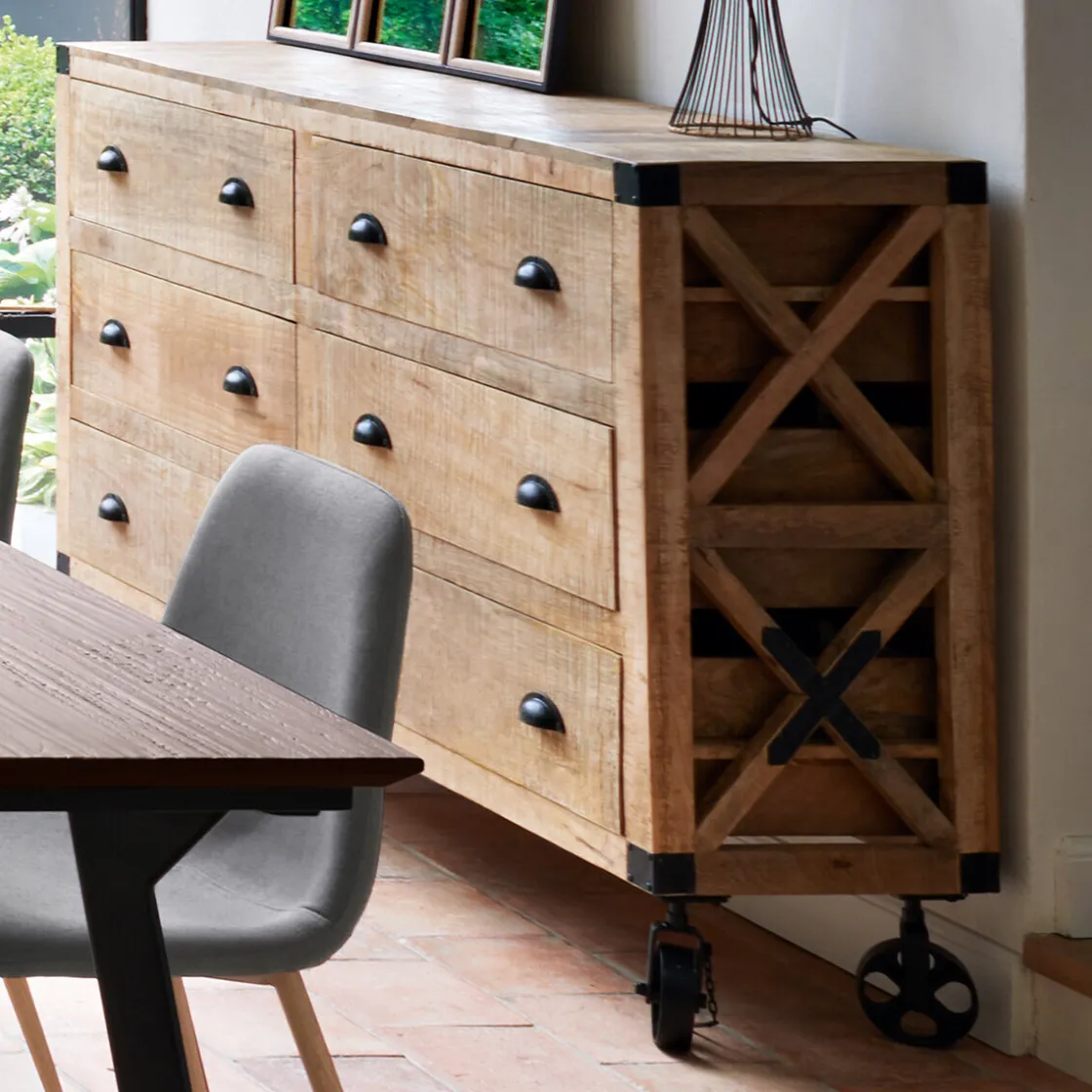 On apprécie le design épuré du buffet « Silas » ainsi que sa praticité. Réalisé en bois de manguier, il est résistant, mais aussi fonctionnel : il est composé de six tiroirs disposés sur des roues en métal.