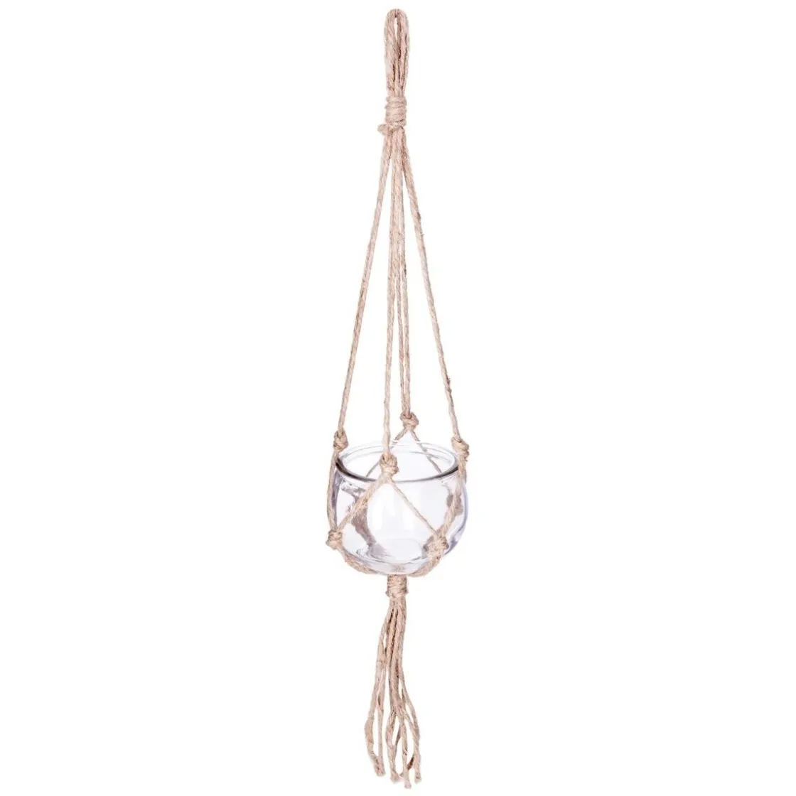 Ce cache pot est en verre. Il se suspend grâce à la corde en jute végétal. Le mélange du verre et du jute végétal fonctionne à merveille et donne un véritable caractère à l’objet. Suspendez-le à une fenêtre ou au plafond pour qu’il puisse être bien en vue.