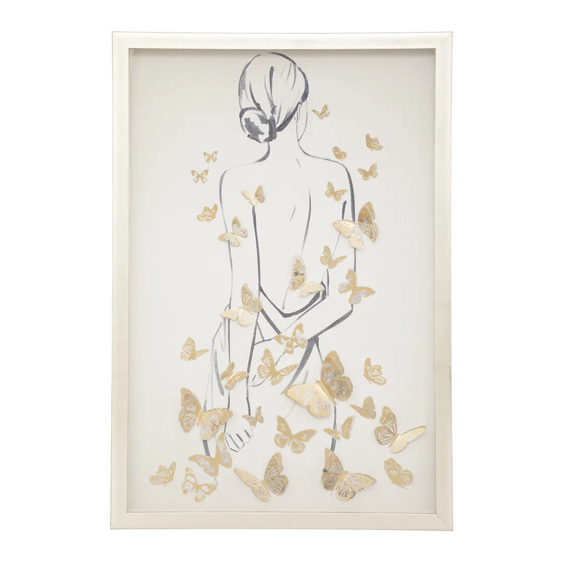 La toile « Diane » est composée d’un grand cadre rectangulaire en bois, dont la vitre abrite la silhouette d’une femme au dos nu, entièrement constellée de papillons en reliefs. De format moyen, elle s’invitera volontiers dans une chambre à coucher et participera à une ambiance chaleureuse!