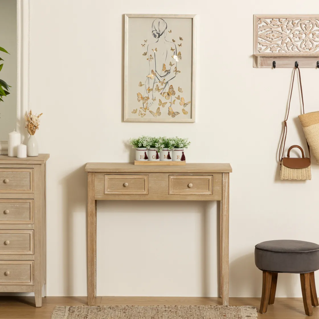 Fixez votre toile « Diane » au-dessus d’une commode en bois Atmosphera et ajoutez un vase garni de fleurs séchées à ses côtés.