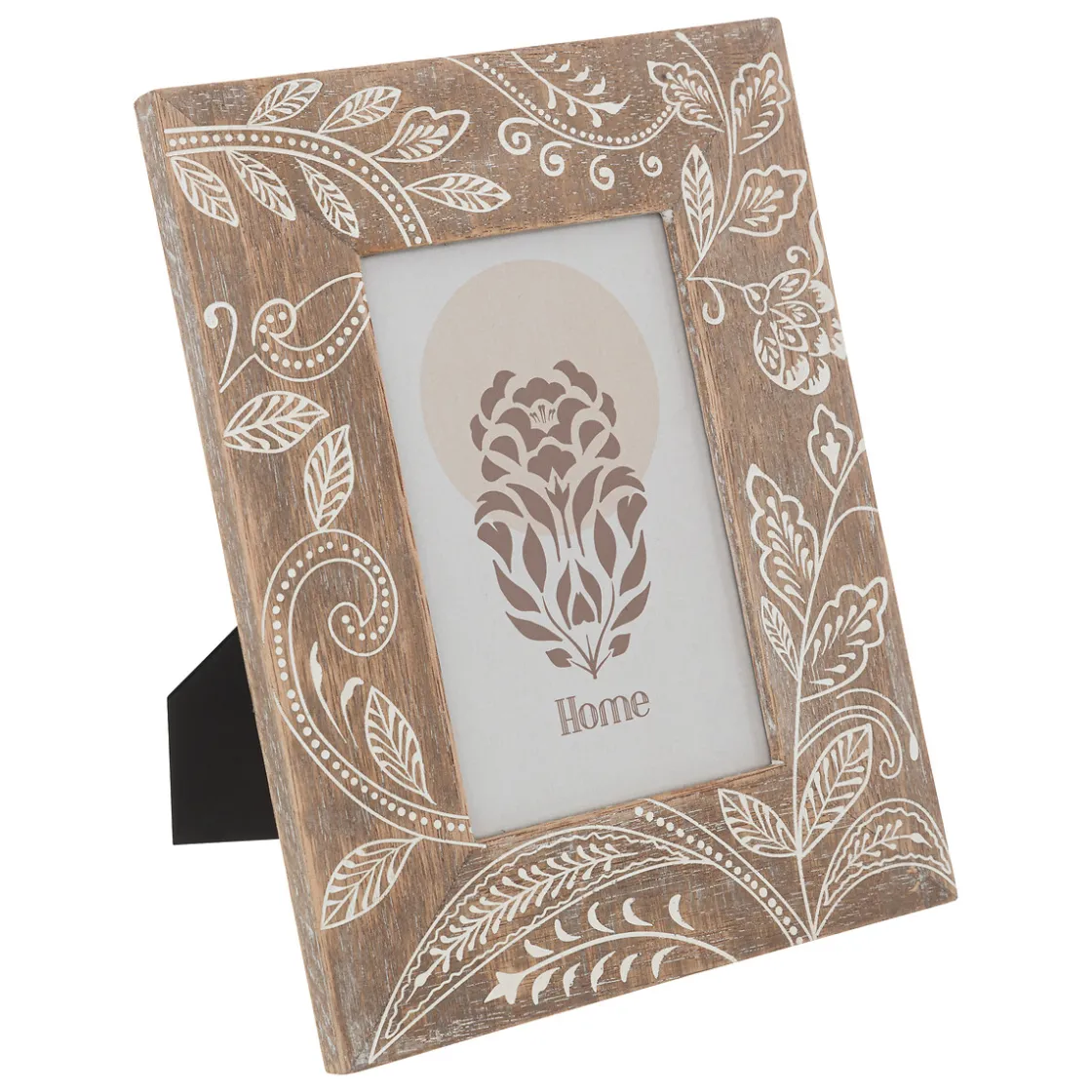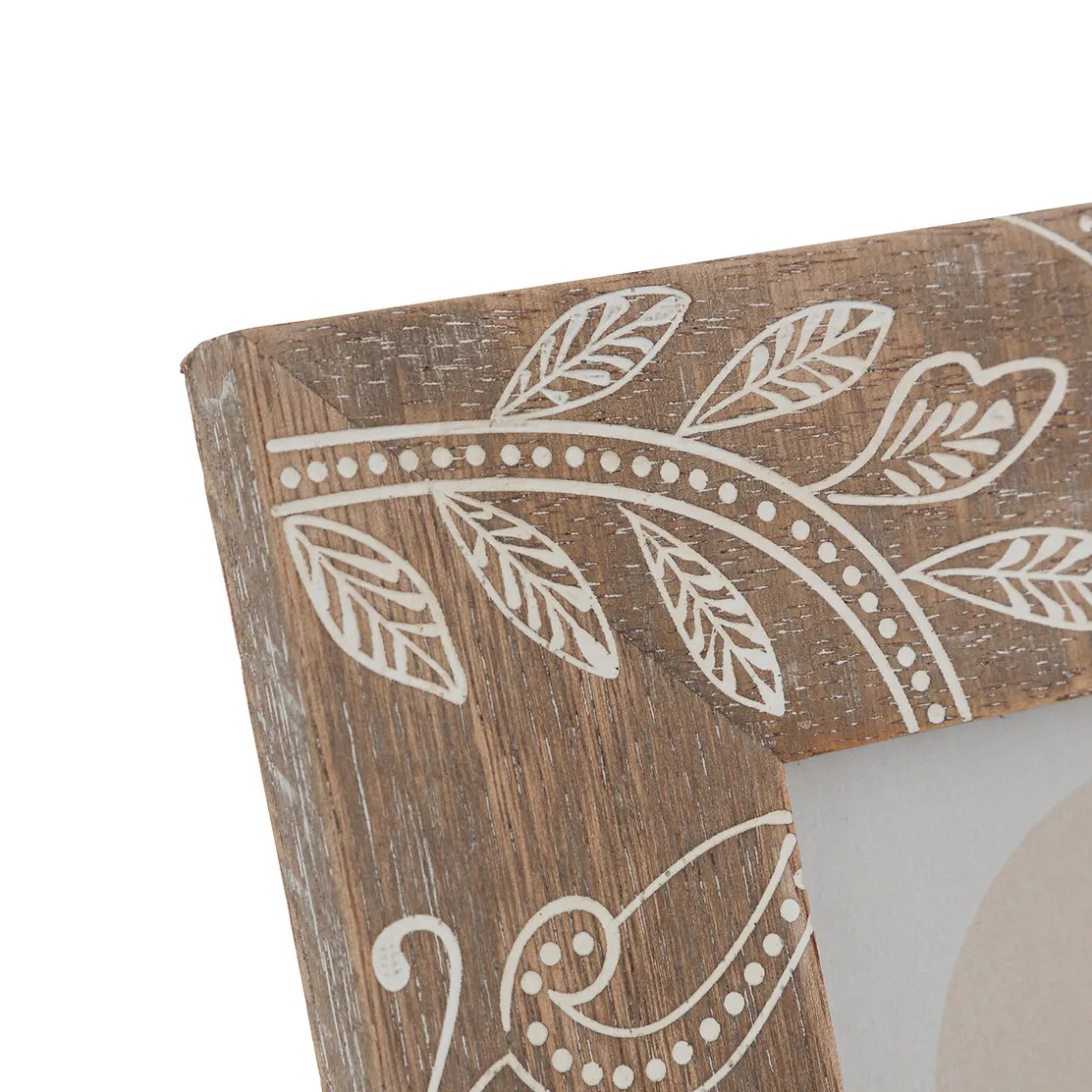 Réalisé en bois, le cadre photo « Bonie » se distingue par ses motifs fleuris, peints sur toute la largeur du cadre. Il vous permettra d’exposer une photo personnelle comme une carte illustrée et il tiendra facilement debout sur un meuble grâce à une cravate.