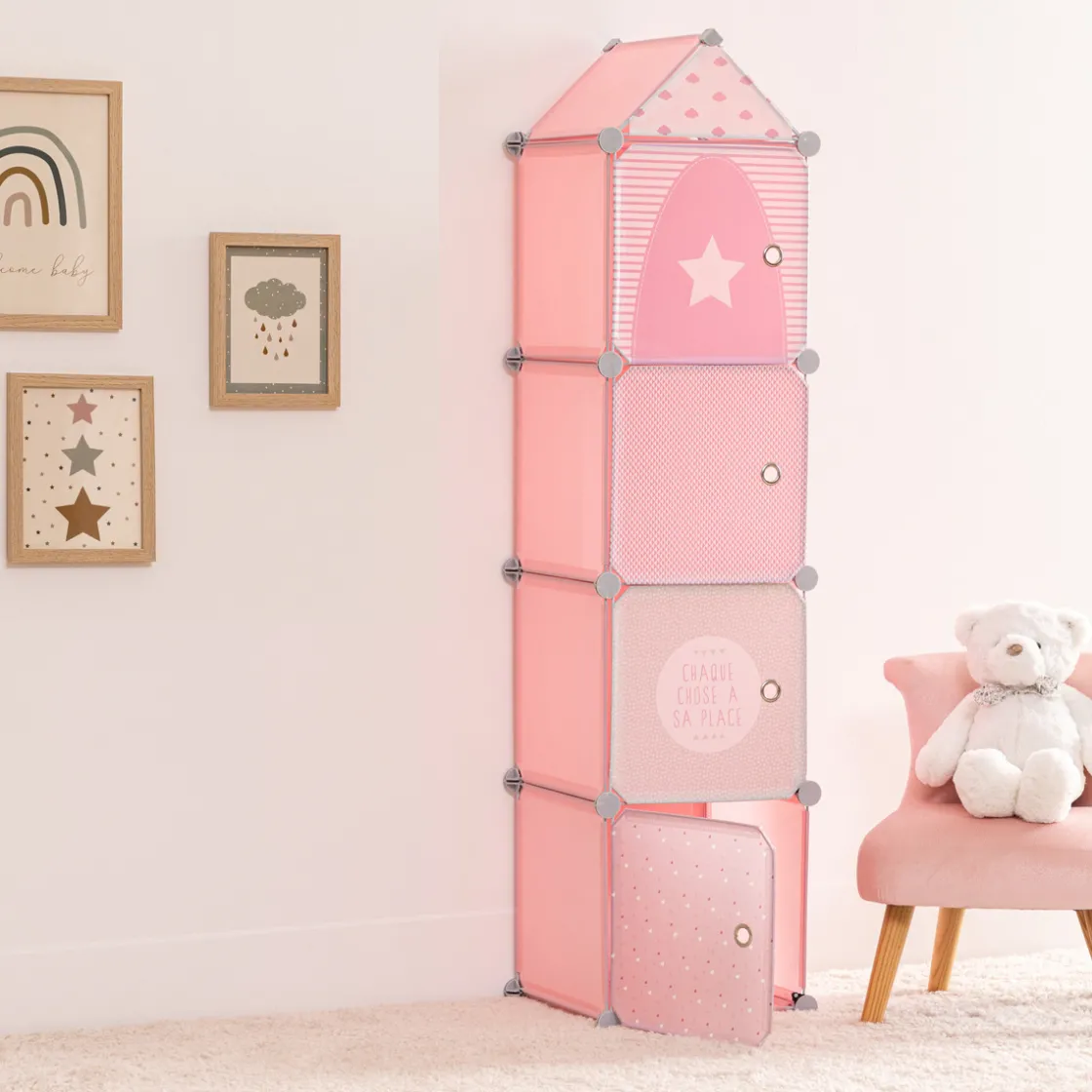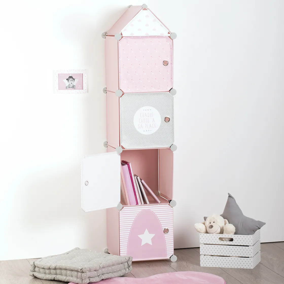 Grâce à sa hauteur adaptée, cette tour restera à portée de main de votre enfant. Il pourra ainsi ranger et prendre ses affaires tout seul, après avoir aisément ouvert les portes aimantées. Outre ses motifs graphiques, la tour est dotée d’un toit qui lui donne une amusante allure de maisonnette/