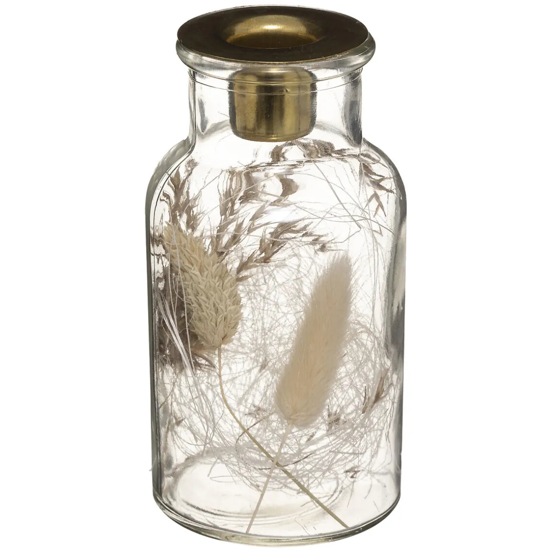Ce chandelier de fleurs séchées en verre est une véritable trouvaille déco ! Le flacon d’une hauteur de 13 cm accueille une ravissante composition de fleurs séchées, que la transparence du verre permet d’admirer. Le col est équipé d’un bougeoir en métal vieilli destiné à recevoir une bougie, pour un éclairage très chaleureux.