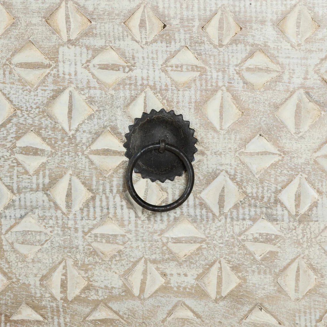 En bois sculpté à la main en Inde, son originalité réside dans son design : six tiroirs disposés de façon asymétrique les uns sur les autres, avec des poignées différentes pour chacun.