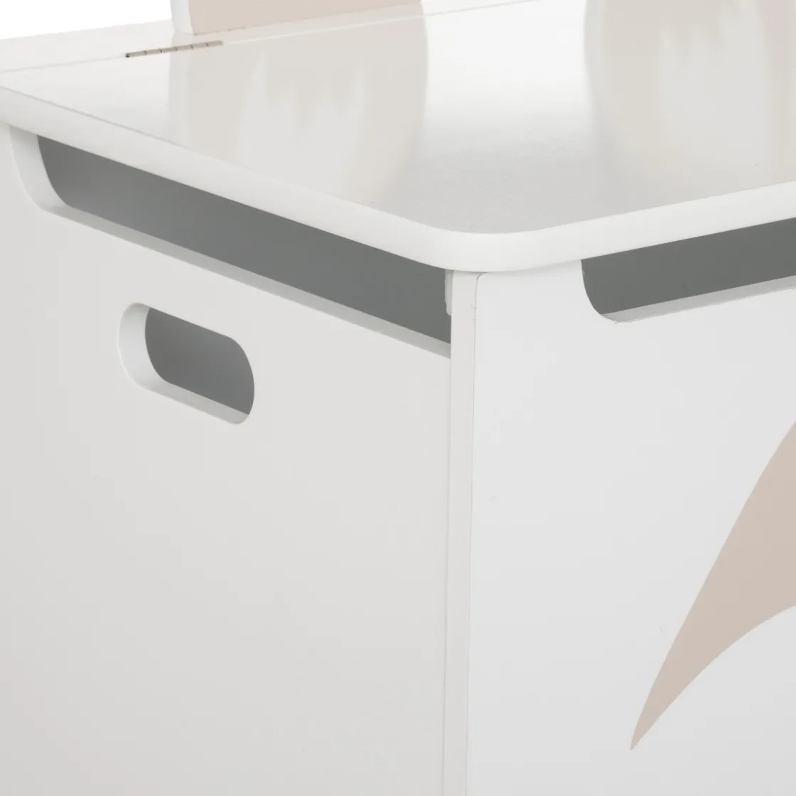 Très facile à ouvrir grâce à de grandes encoches, les petits doigts seront protégés! Peint d’une jolie tête de renard dont les oreilles dépassent en relief sur le dessus, c’est un meuble chaleureux et amusant.