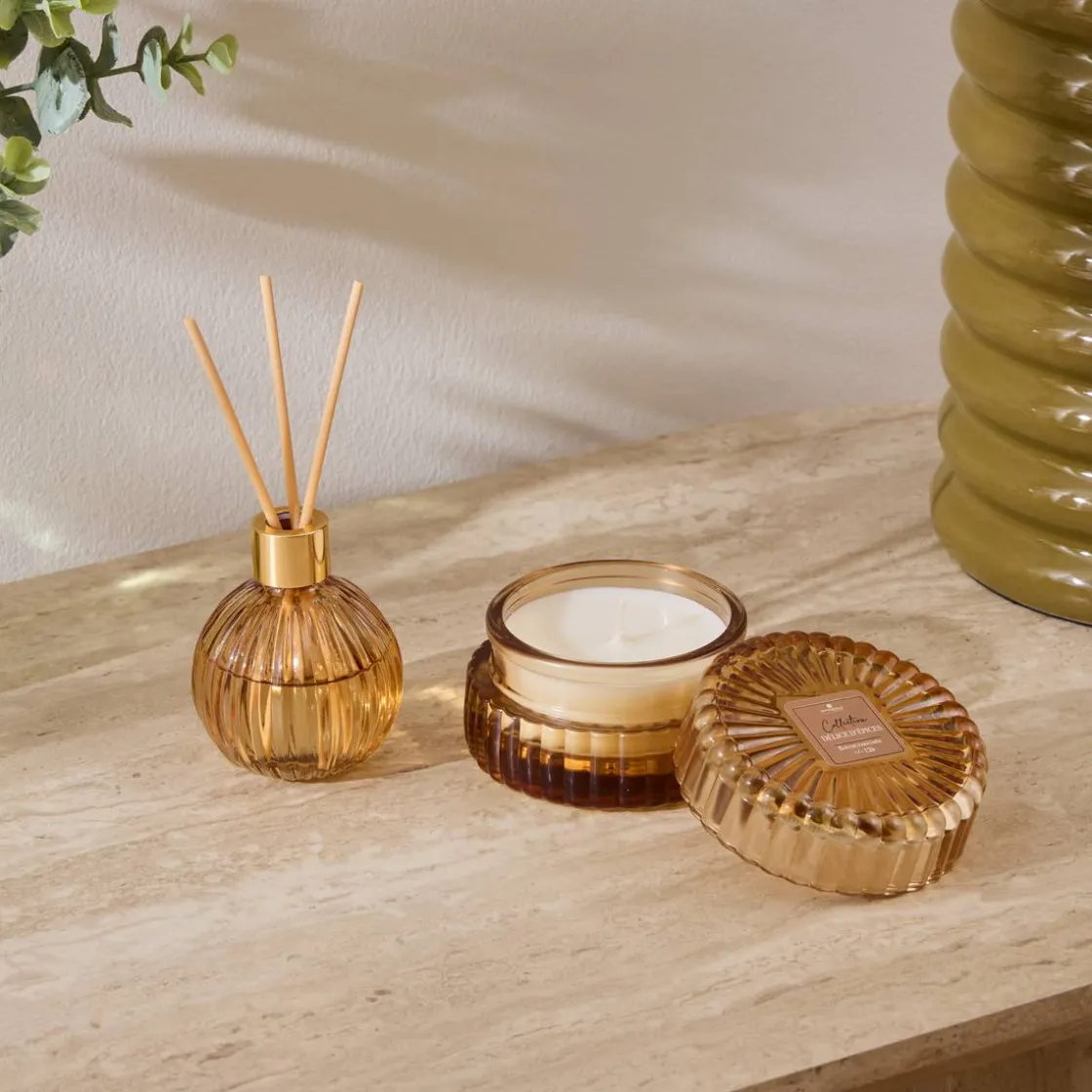 Le coffret sans support Albie Atmosphera est composé d’un diffuseur de parfum en verre teinté ainsi que d’une bougie parfumée*, placée dans un contenant cylindrique en verre strié. Le diffuseur de parfum est équipé de bâtonnets en rotin et l’ensemble sera du meilleur effet une fois réparti sur une étagère ou une table basse.