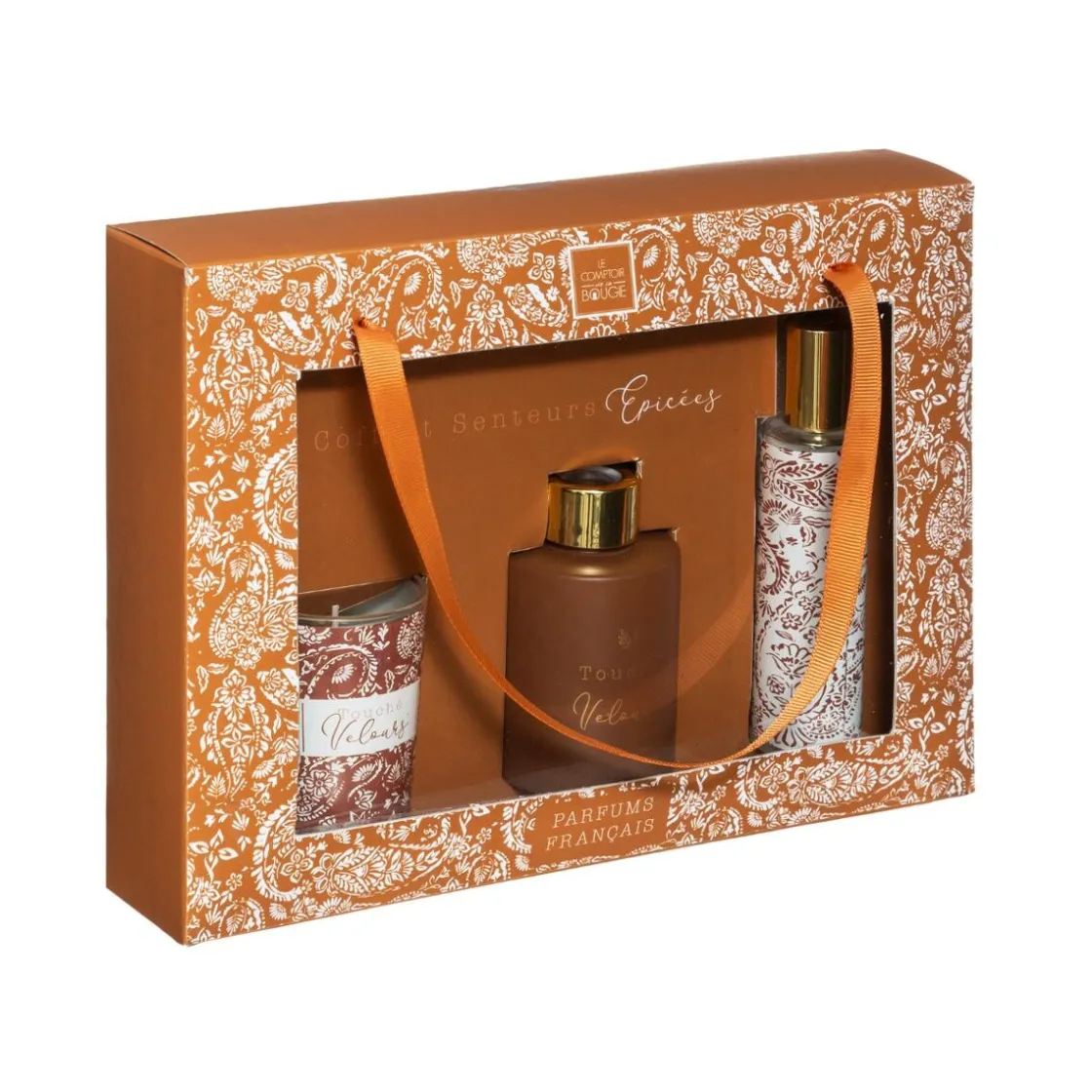 Les éléments de ce coffret possèdent un parfum délicat qui enveloppera toute la pièce. À vous de choisir votre sillage olfactif : épicé, floral ou oriental. Vous aurez à votre disposition trois accessoires : une bougie dans un contenant en verre à motif, un flacon d’huile parfumée* et un diffuseur avec bâtonnets en rotin.