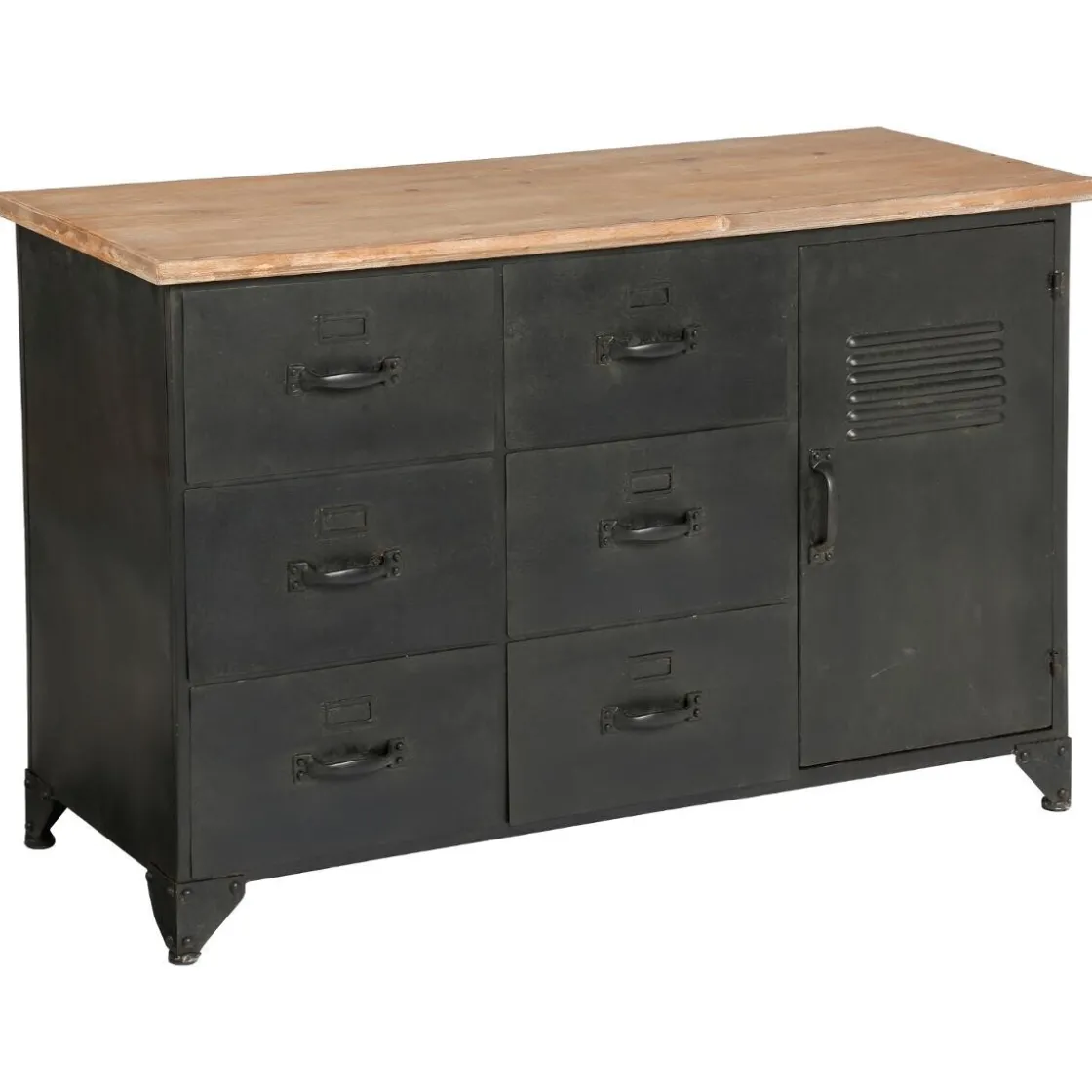 Une structure en métal uni, des pieds ornés de clous et un épais plateau en bois : cette commode plaît grâce à son côté récup customisé. De plus, la porte est dotée d’aération et les tiroirs comportent chacun un porte-étiquette, des détails propres aux anciens casiers d’atelier.