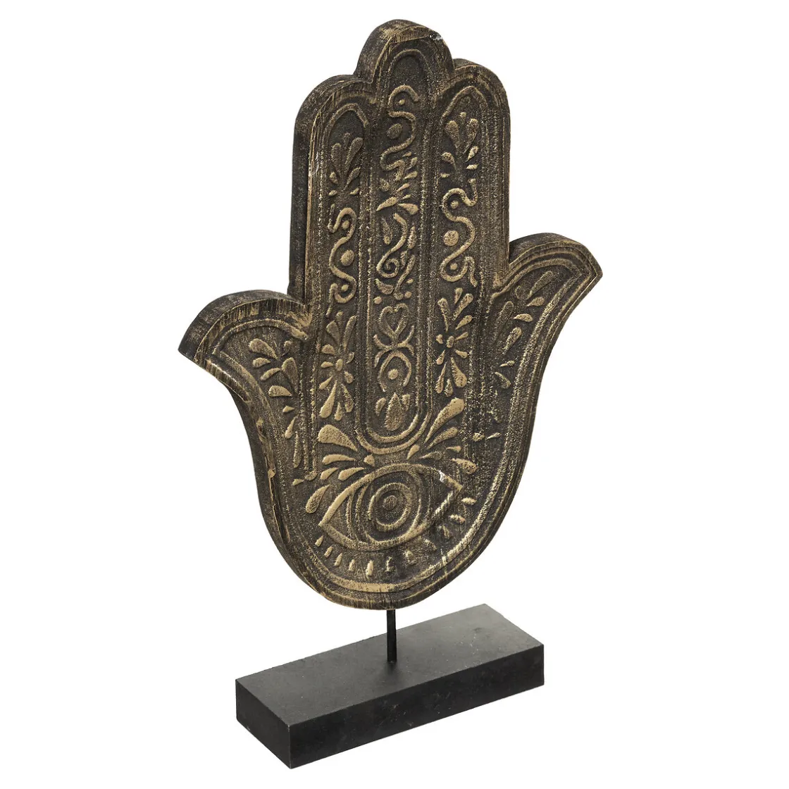 Cette déco main fatma « Oasis » trouvera sa place au milieu de matières naturelles et de souvenirs de voyage. Réalisée en bois et métal, la main aux accents mordorés est solidement fixée sur un socle. Exposez-la sur une console d’entrée ou sur un buffet afin de créer une ambiance exotique !