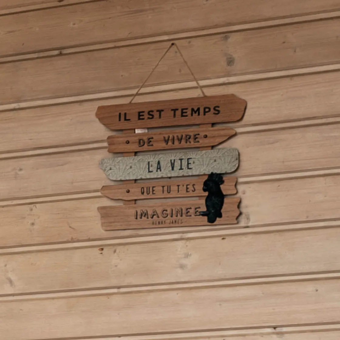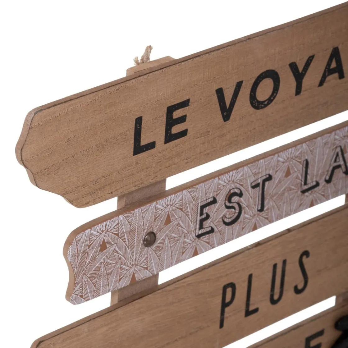 Cette déco murale « cuba » se compose de 5 planches en fibres de bois aux contours irréguliers qui confèrent à l’ensemble un style brut. Décoré d’une statuette en résine, cette déco est peinte d’un message en forme de mantra et se suspend grâce à une corde en chanvre. Quelques clous en métal viennent parfaire cet accessoire chaleureux!