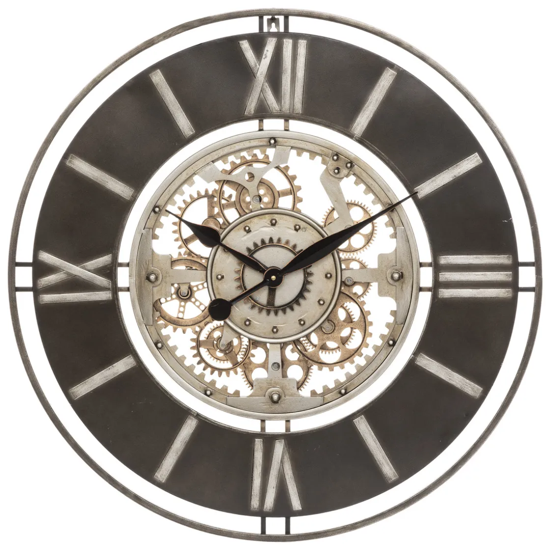 Le diamètre généreux de cette horloge murale vintage en métal éblouira vos invités. Tout en rondeur, elle présente des rouages au centre, des aiguilles authentiques, et des chiffres romains tout autour du cadran. Cet accessoire original s’intègrera parfaitement dans un intérieur au style néo-industriel.