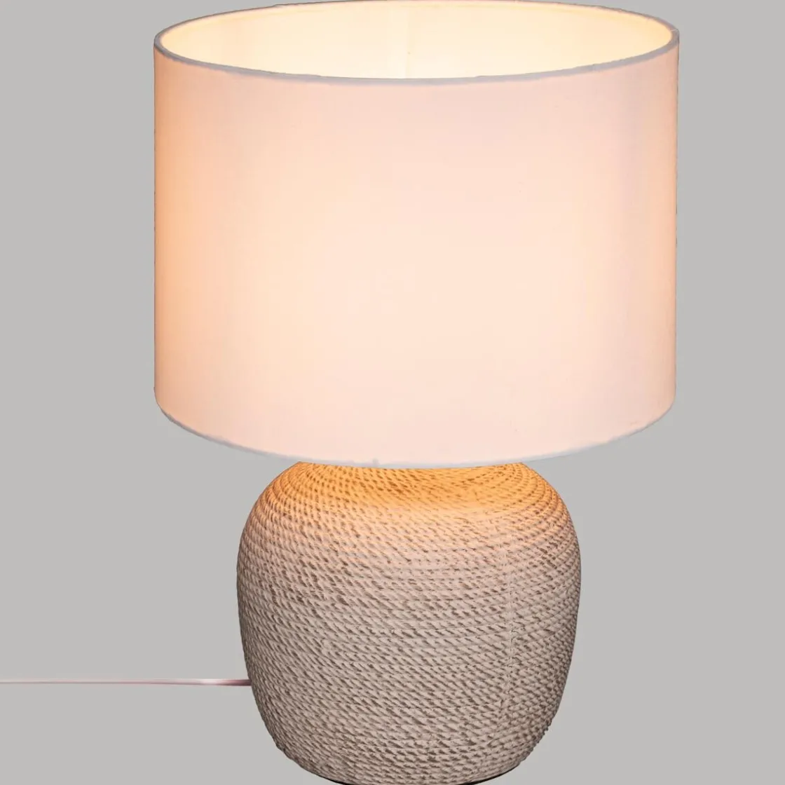 Cette lampe « Davia » se compose d’un socle arrondi en céramique habillé d’un effet corde et d’un abat-jour cylindrique en coton.