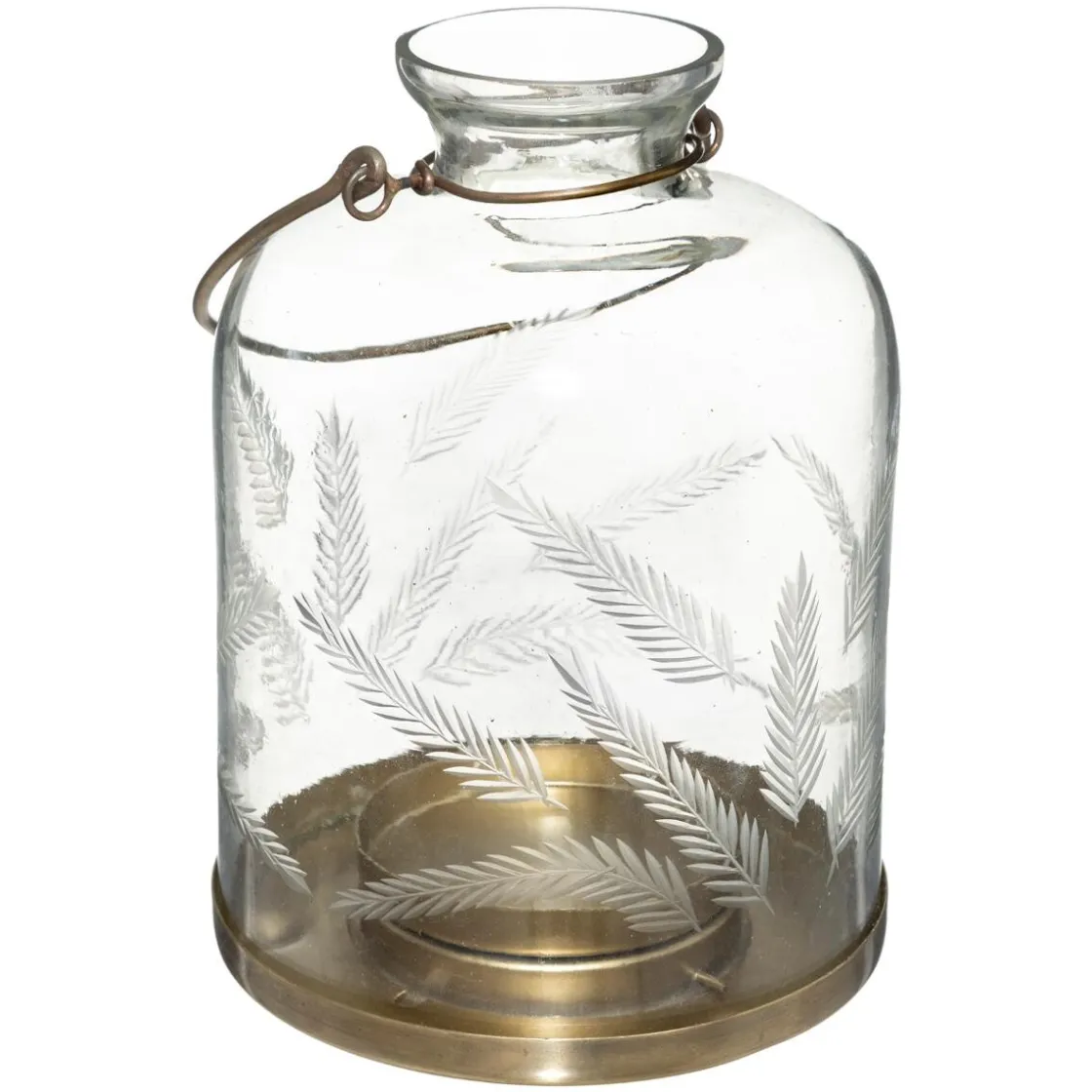 Cette lanterne se compose d’une cloche en verre ciselé décorée de motifs en forme de palmes, d’une anse minimaliste en métal et d’un socle en métal qui intègre un espace dédié à une bougie. La partie en verre possède une ouverture sur le haut.