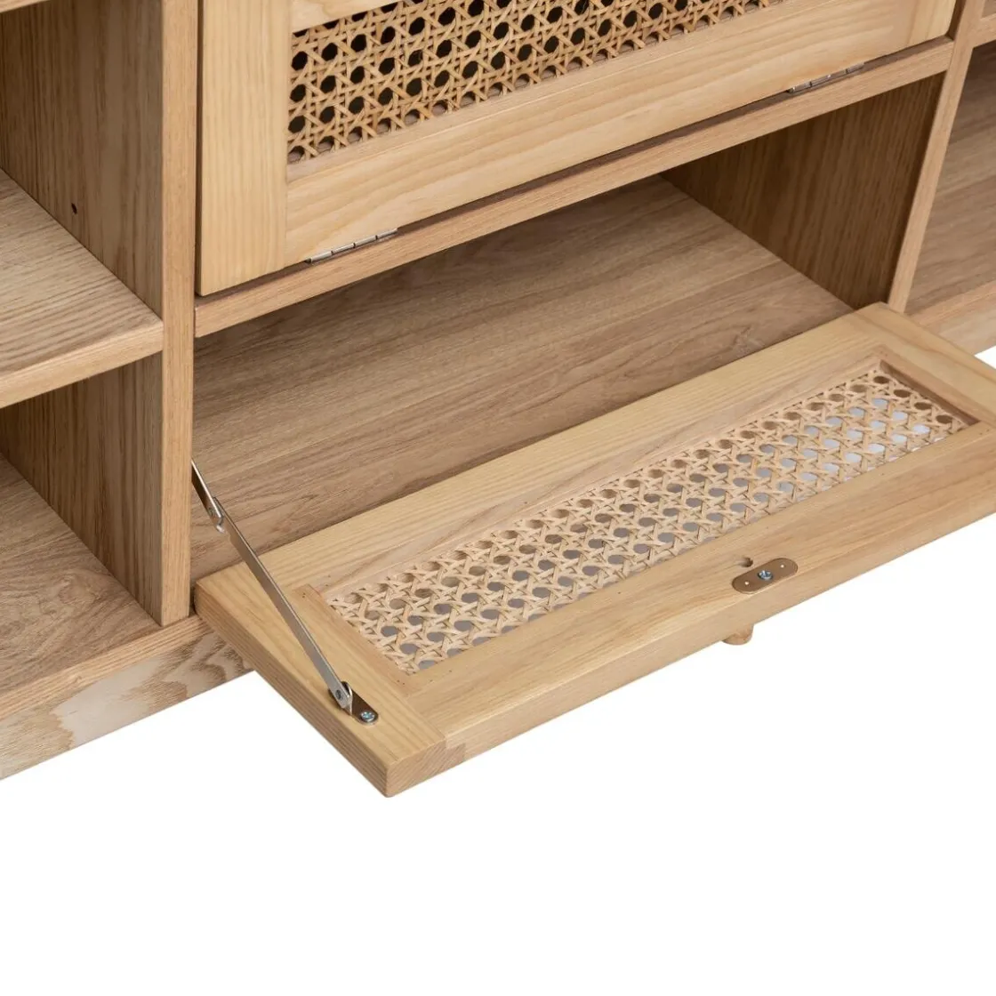 Habillé de frêne clair robuste avec veines apparentes, ce meuble télé sur pied adopte un style chaleureux, rehaussé de cannage en rotin. Une présence élégante et discrète très appréciée au salon, mais aussi dans la chambre.