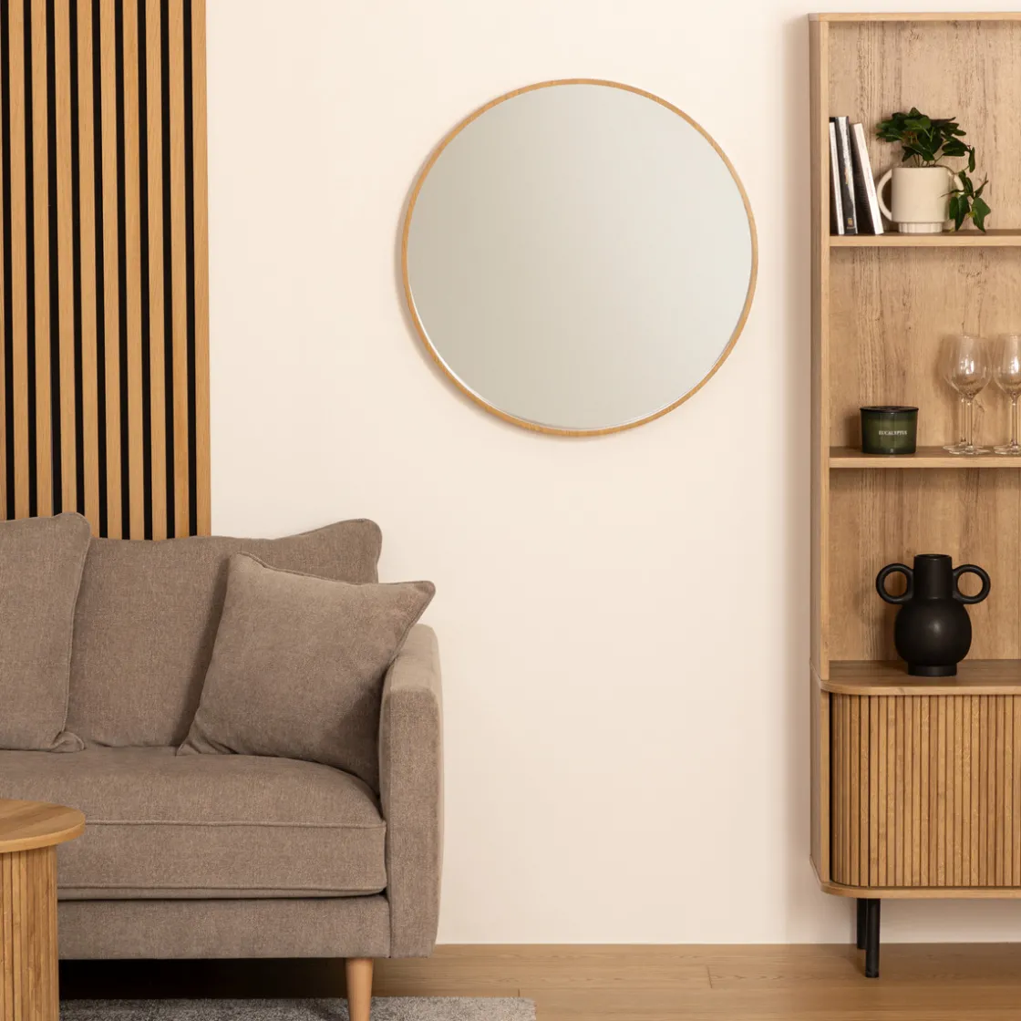Accompagnez ce miroir rond de quelques plantes vertes disposées dans des cache-pots en céramique sur pied.