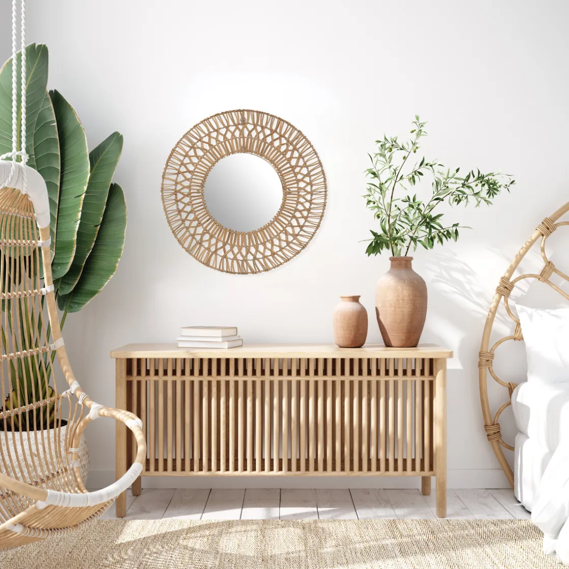 Fixez votre miroir « Milou » au-dessus d’une console en bois de manguier Atmospheraet profitez d’un décor propice à l’évasion!