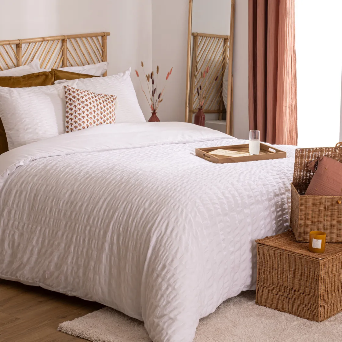 Conçu pour un grand lit deux personnes, cet ensemble comprend une housse de couette et deux taies d’oreiller carrées. Le tissu aérien est agrémenté de jolies rayures plissées. De plus, la parure de lit « Irhia » ne nécessite pas de repassage pour vous faciliter son entretien.