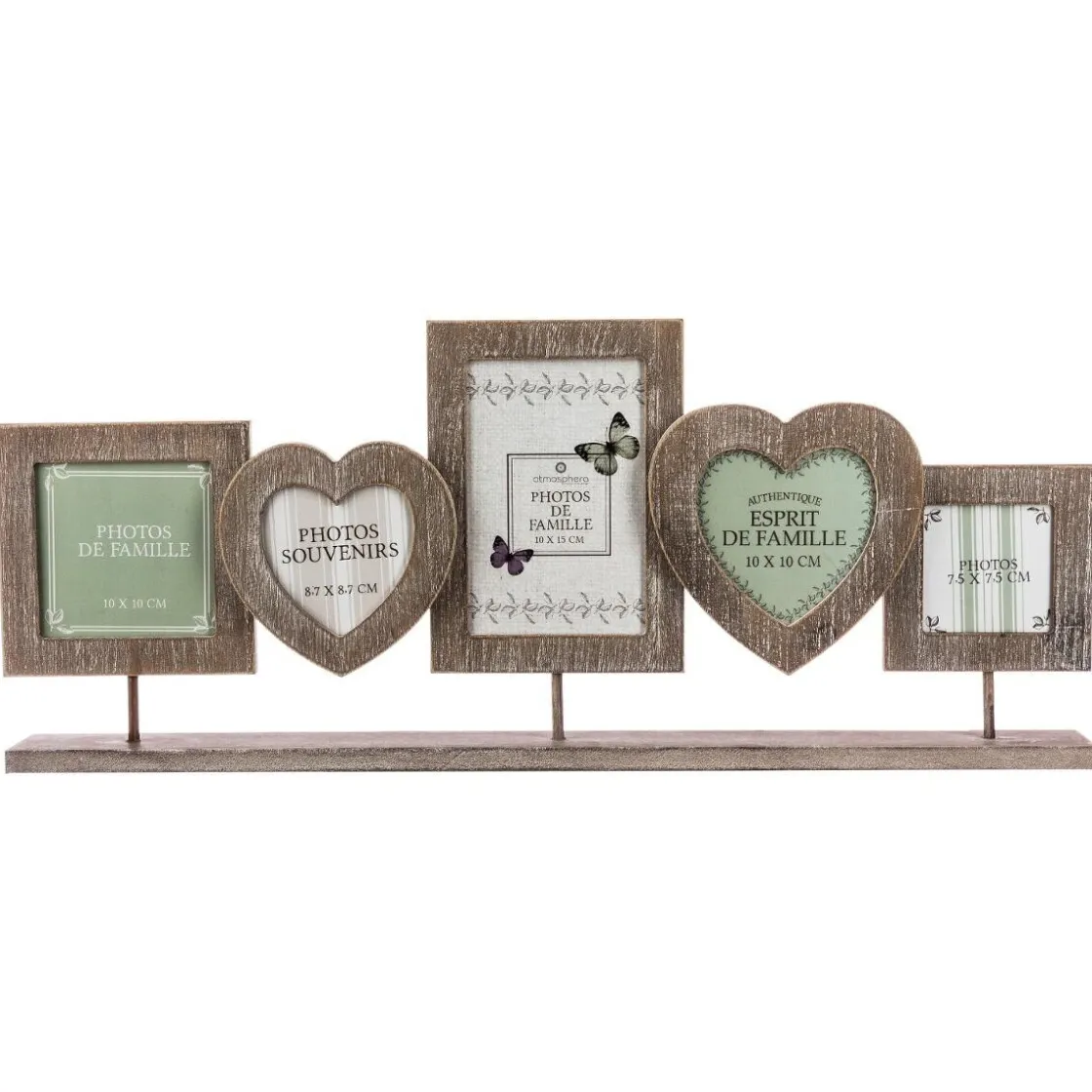 Ce pêle-mêle à poser « Charme » très original est réalisé en métal et offre 5 cadres de formes différentes. Coeur, rectangle ou carré, ils sont fixés entre eux et reliés au socle grâce à des tiges métalliques. L’aspect cérusé du bois participera à créer une ambiance très chaleureuse!