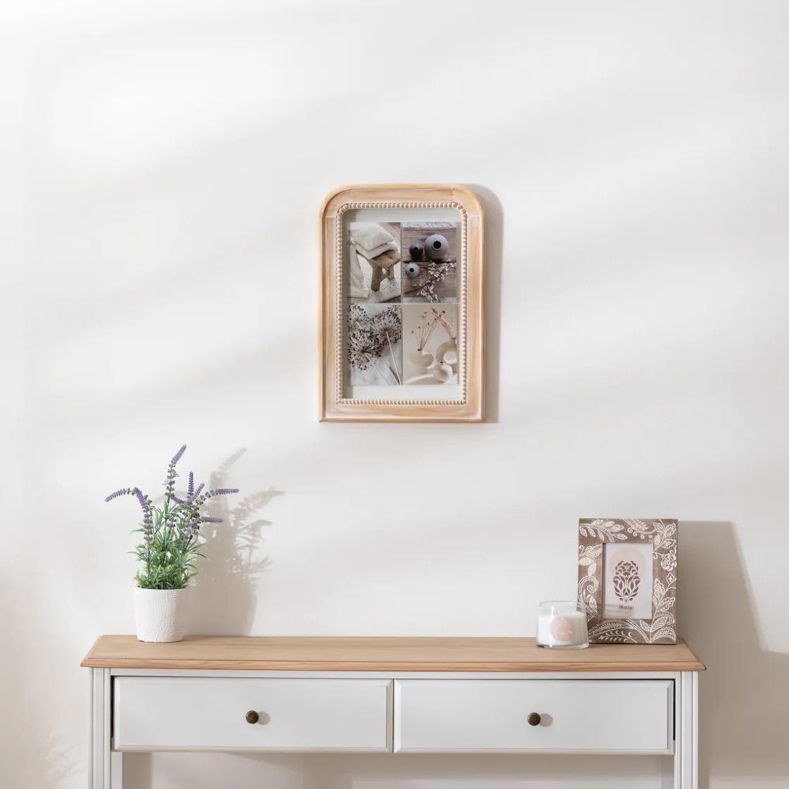 Installez votre pêle-mêle « Elena » au-dessus d’une commode en bois blanchi Atmosphera.