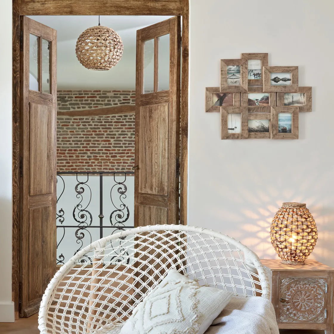 Accrochez ce pêle-mêle au-dessus d’une console Atmosphera en bois de manguier, accompagné de pots de fleurs en céramique pour mettre à l’honneur les matériaux bruts!