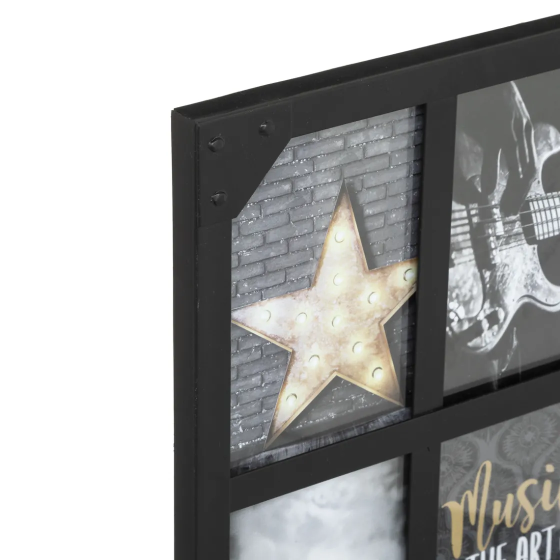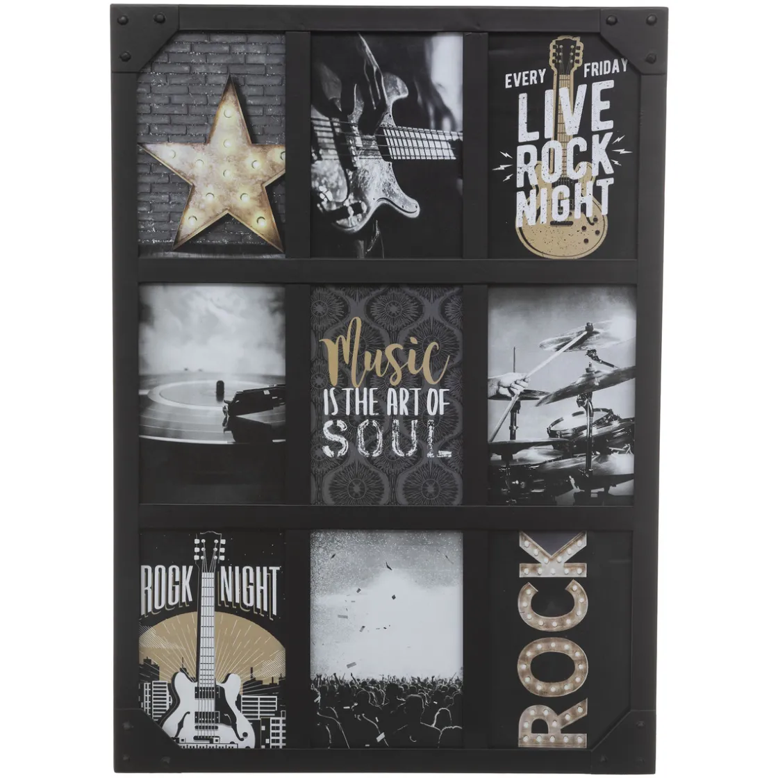 Le pêle-mêle « Lola » est réalisé dans un mélange de bois et de métal, et il obéit à une forme rectangulaire. 6 cadres vitrés vous permettront de mettre en valeur une sélection de photos ou de cartes au format portrait. Avec ses vis apparentes et son bois foncé, ce pêle-mêle déposera une note résolument authentique et rétro dans votre déco!