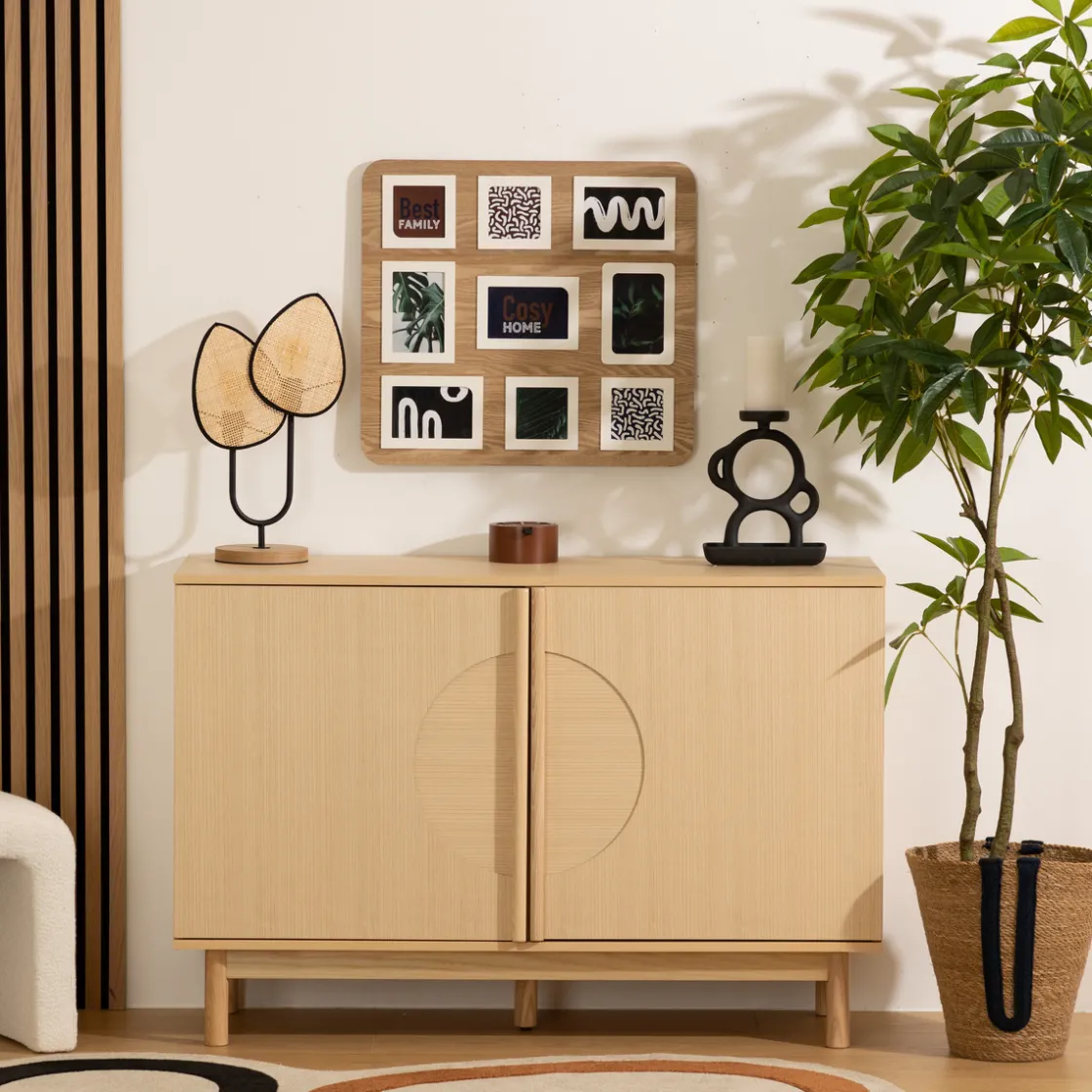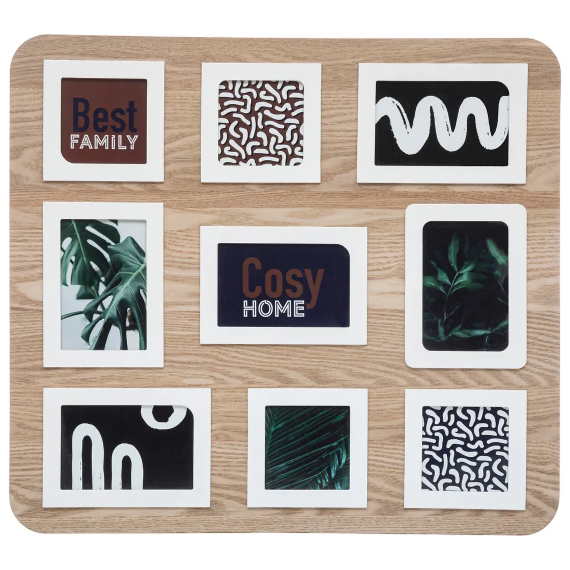 Réalisé à partir d’un grand panneau de bois clair, ce pêle-mêle « Marlon » vous permettra d’exposer 9 de vos photos favorites, que vous pourrez intercaler avec des cartes arty ou des illustrations. Dans une entrée comme dans un bureau ou une chambre, il déposera une touche chaleureuse dans votre univers déco.