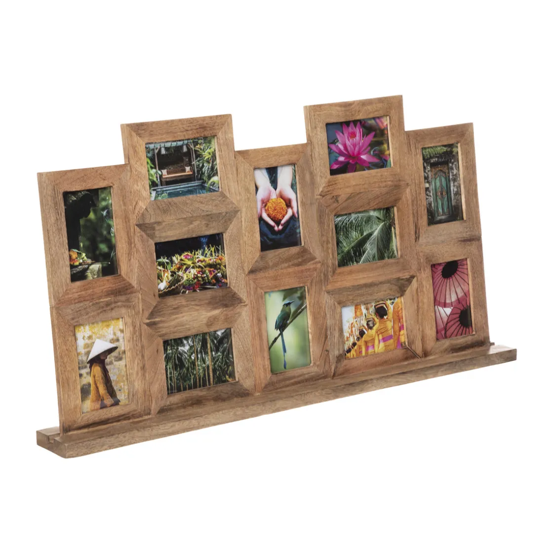 Réalisé en bois de manguier aux finitions brutes, ce pêle-mêle « Nam » est composé d’un cadre rectangulaire fixé à un large socle. Légèrement incliné, il offre 12 cadres vitrés qui vous permettront d’exposer des photos aux formats paysage et portrait.