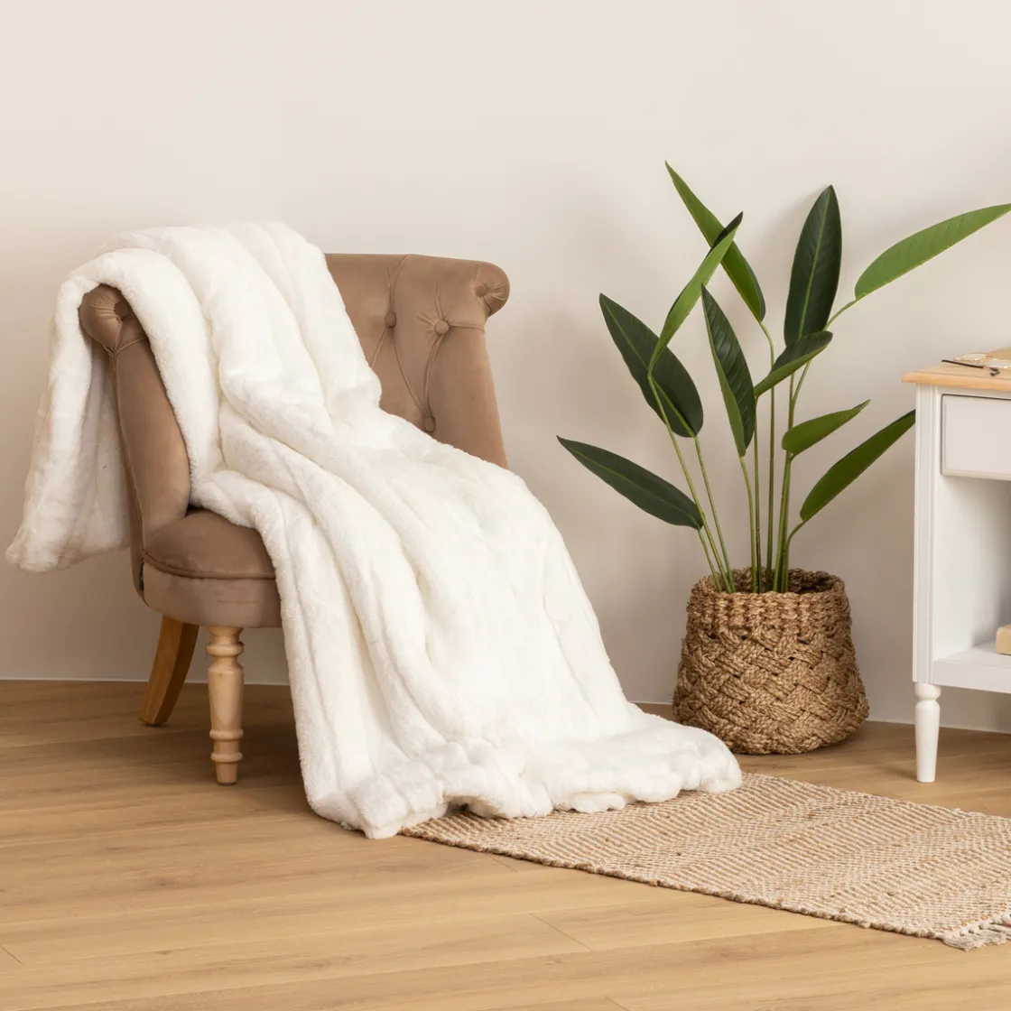 Pour une ambiance plus scandinave, associez votre plaid « Manoir » à des meubles en bois naturel Atmosphera.
