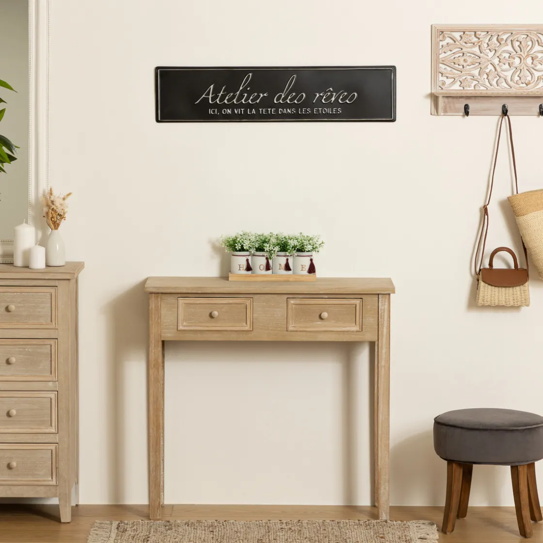 Ajoutez une belle toile imprimée et un grand miroir en bois clair Atmosphera pour parfaire l’ensemble de manière harmonieuse.