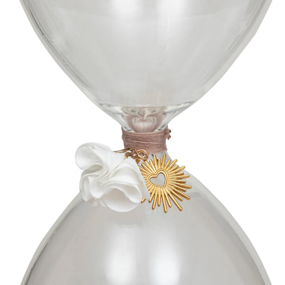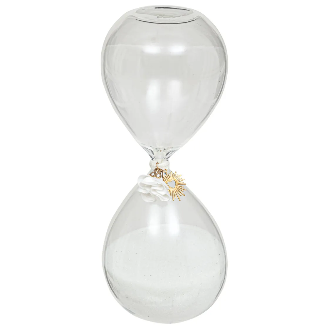 Réalisé en verre transparent, le sablier « Floral » contient suffisamment de sable pour assurer une minuterie de 30mn. Idéal en cuisine sur une étagère, il se distingue par son centre orné d’un lien retenant de petites décorations dorées aux motifs chaleureux. Un accessoire authentique qui sublimera votre univers!