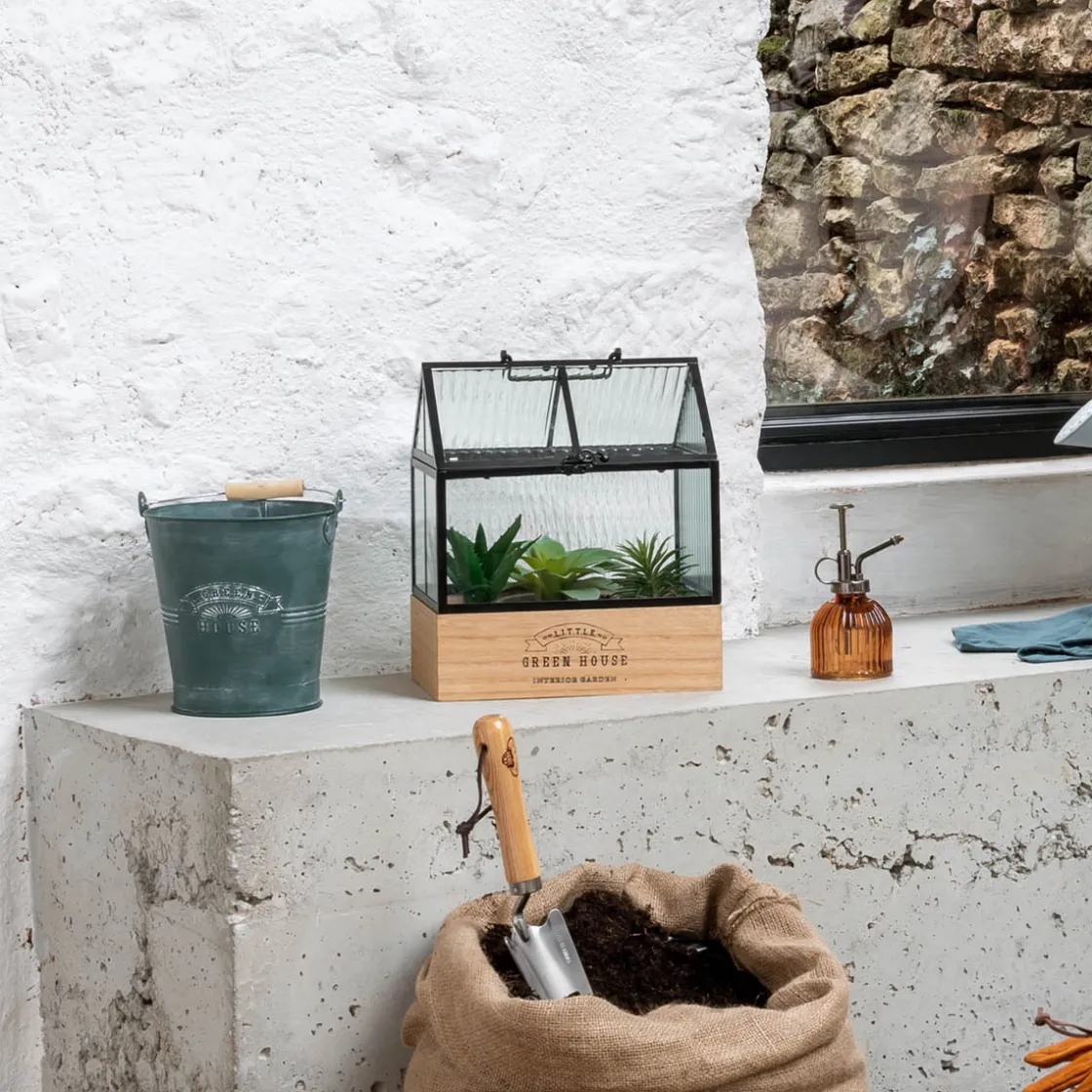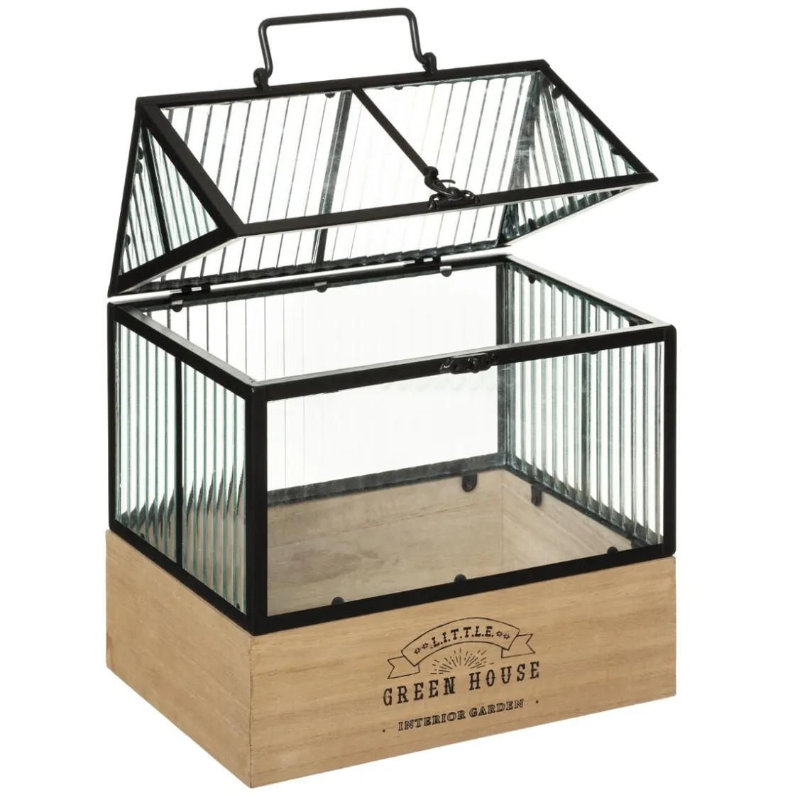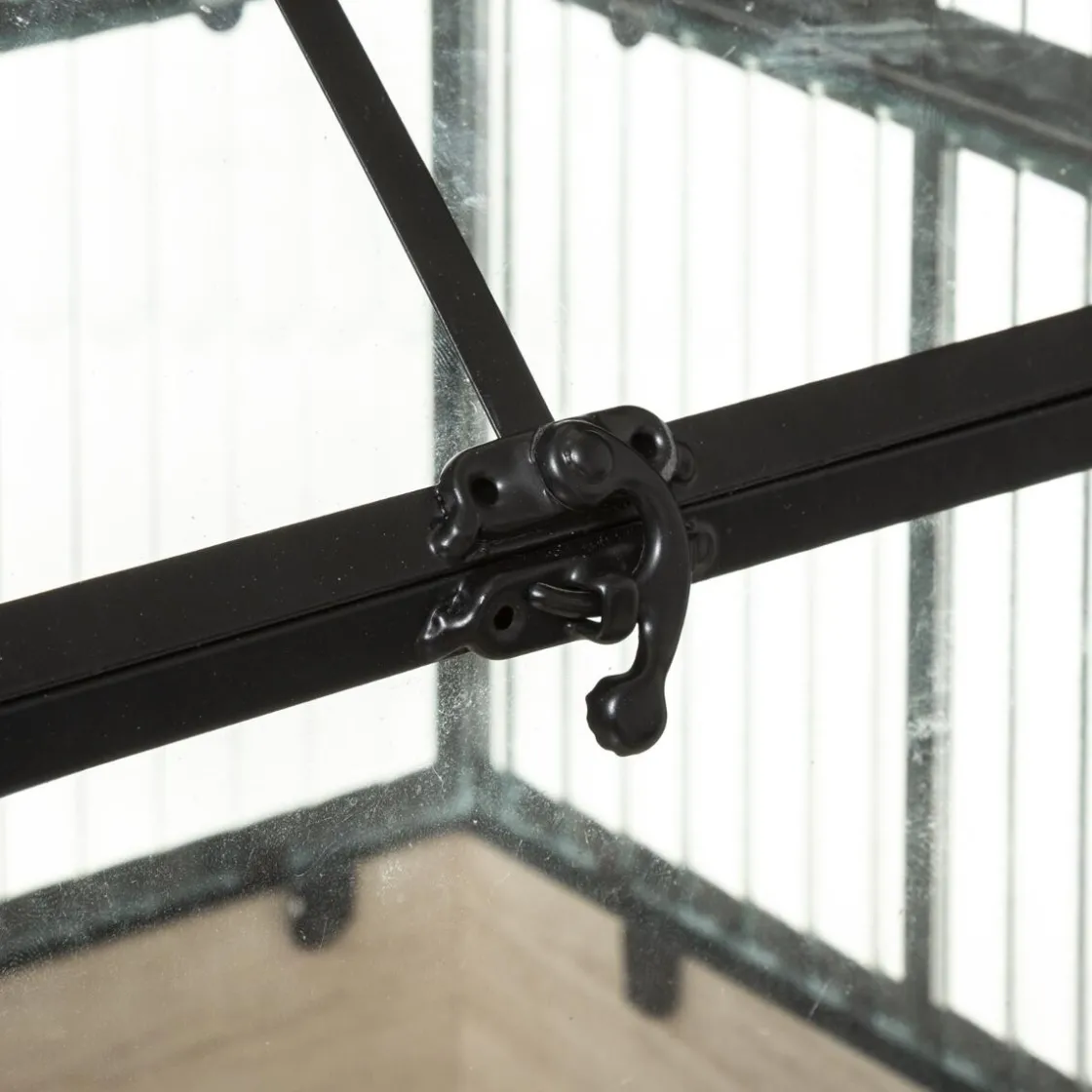 Pour une bonne ventilation, le toit de la serre s’ouvre et se ferme grâce à un crochet. Selon vos envies, elle pourra accueillir des semis, des fleurs, ou des herbes aromatiques. La transparence du verre est conçue pour que les végétaux absorbent correctement la lumière du soleil.