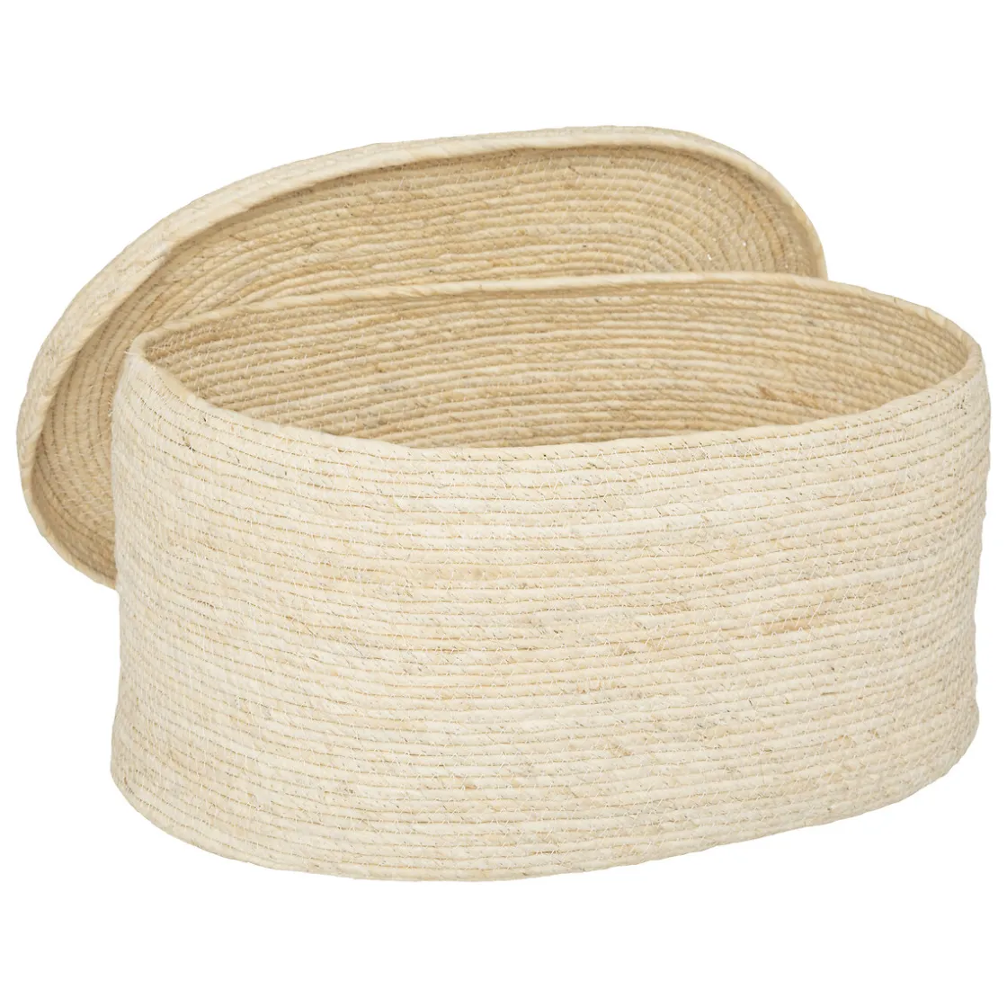 Le set de paniers « Rivi » est composé de 2 paniers ovales, réalisés en tressage de maïs. Fermés par des couvercles, ils vous serviront de rangements d’appoint tout en déposant une touche raffinée.