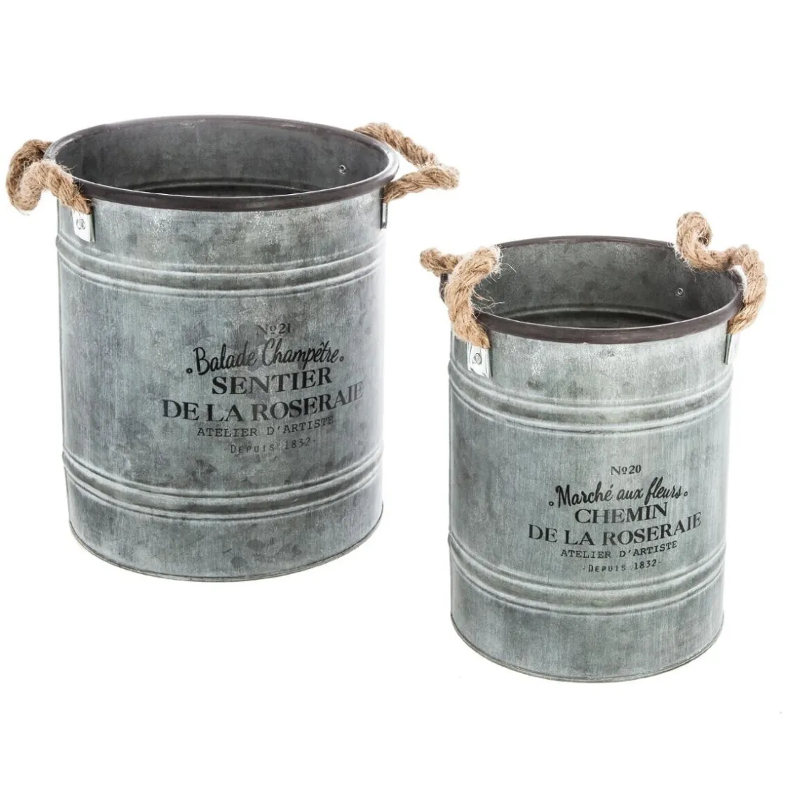 Ce set de 2 seaux en zinc ressemble aux accessoires d’autrefois. Avec leur aspect vieilli et leur inscription vintage, ces objets semblent venir tout droit d’une brocante. De tailles différentes, vous pouvez laisser libre cours à votre imagination pour créer des compositions originales. Les poignées en corde de jute vous permettront de déplacer les seaux facilement.
