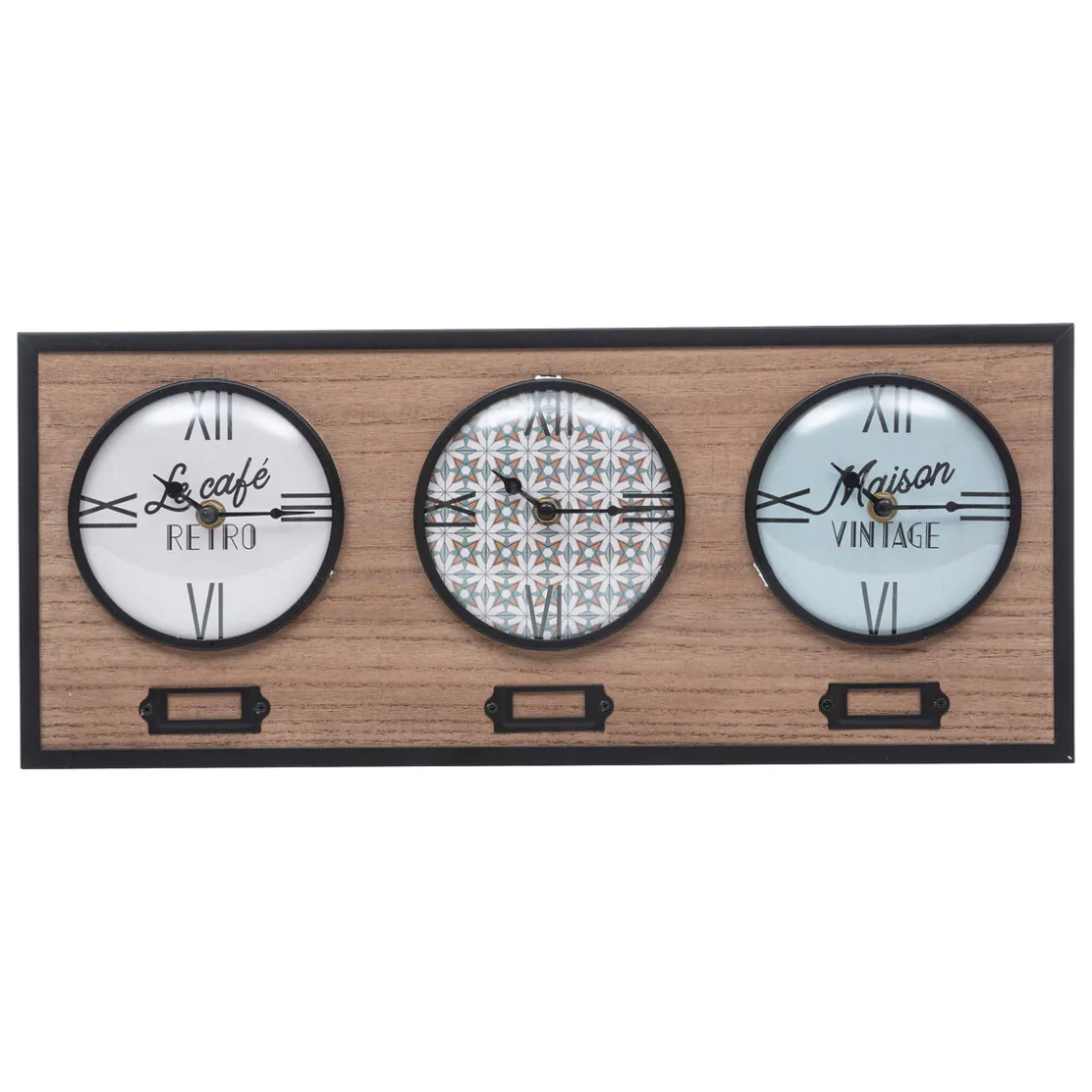 Réalisée dans un mélange chaleureux de bois et de métal cette horloge offre 3 cadrans vitrés dont les fonds sont décorés de motifs différents. Des emplacements métalliques pour étiquettes, placés sous chaque horloge, vous permettront d’indiquer l’heure de plusieurs villesdu monde!