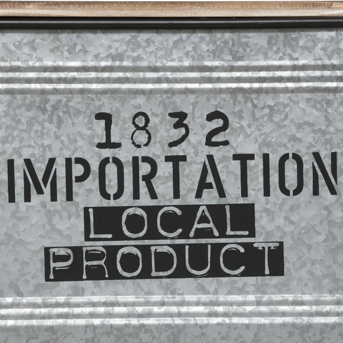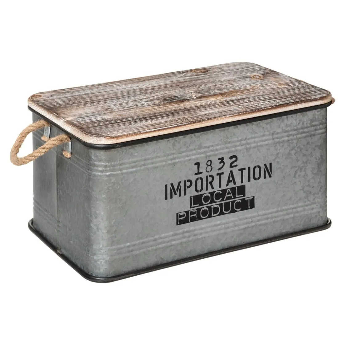 Ces malles en zinc sont munies d’un couvercle en bois patiné pour un rendu authentique. Des inscriptions contrastées inspirées d’anciens éléments de stockage ornent leur façade. Des poignées en corde sont fixées sur les côtés pour les déplacer facilement.