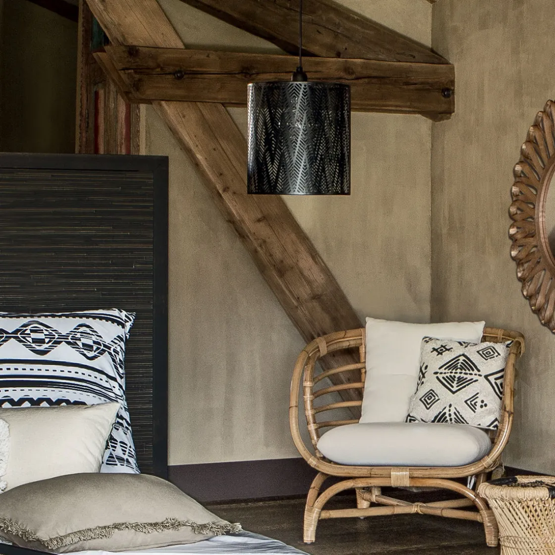 Pour casser le côté contemporain de la suspension, n’hésitez pas à mélanger les matières et les couleurs pour un espace plus bohème.