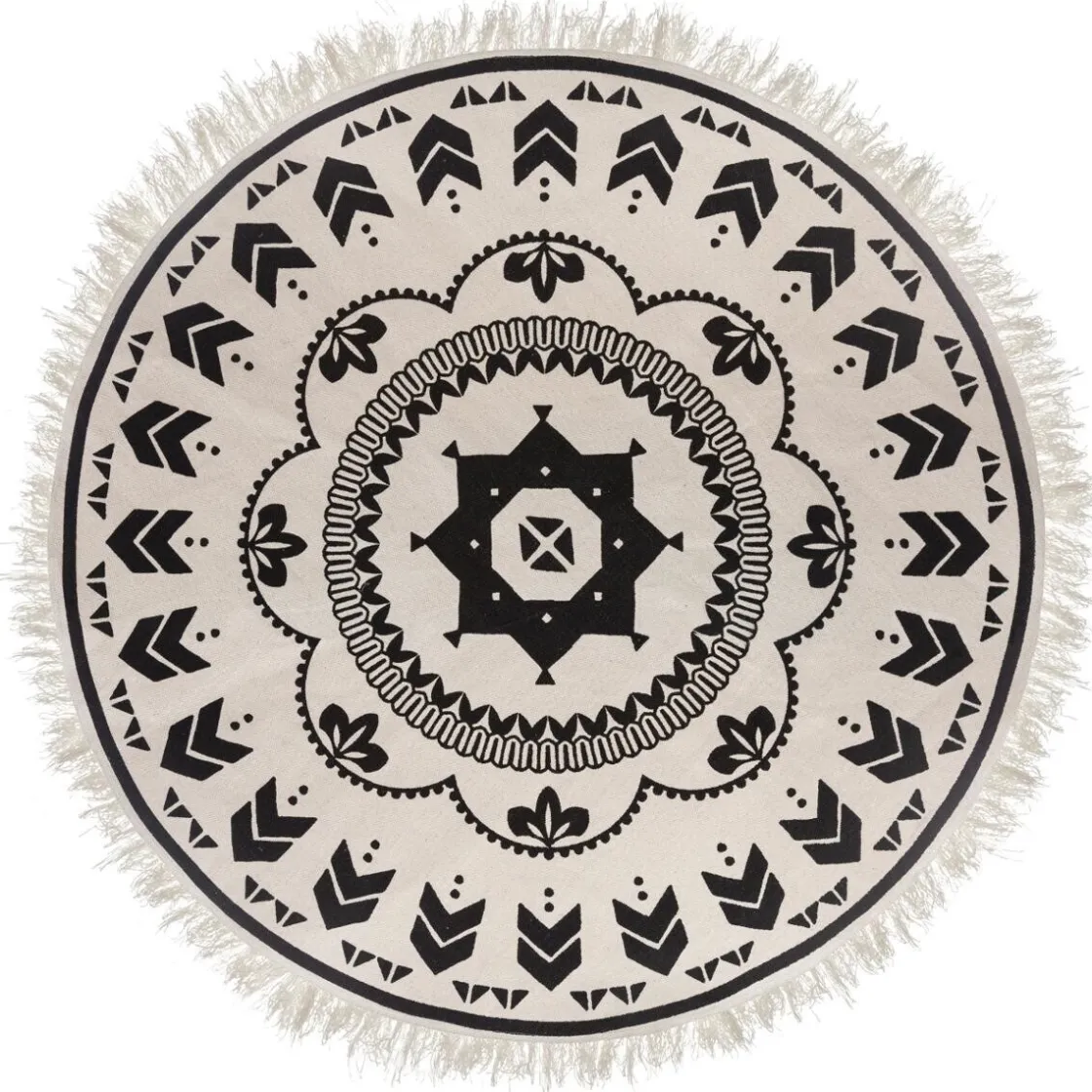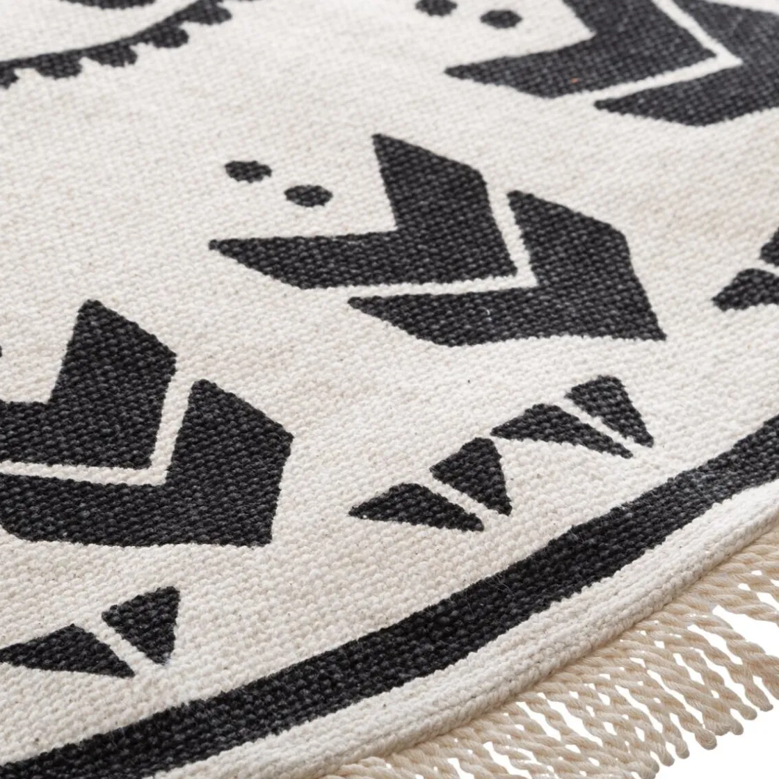 Entouré d’une bordure à fines franges, ce tapis en coton affiche des motifs géométriques organisés en cercles concentriques.