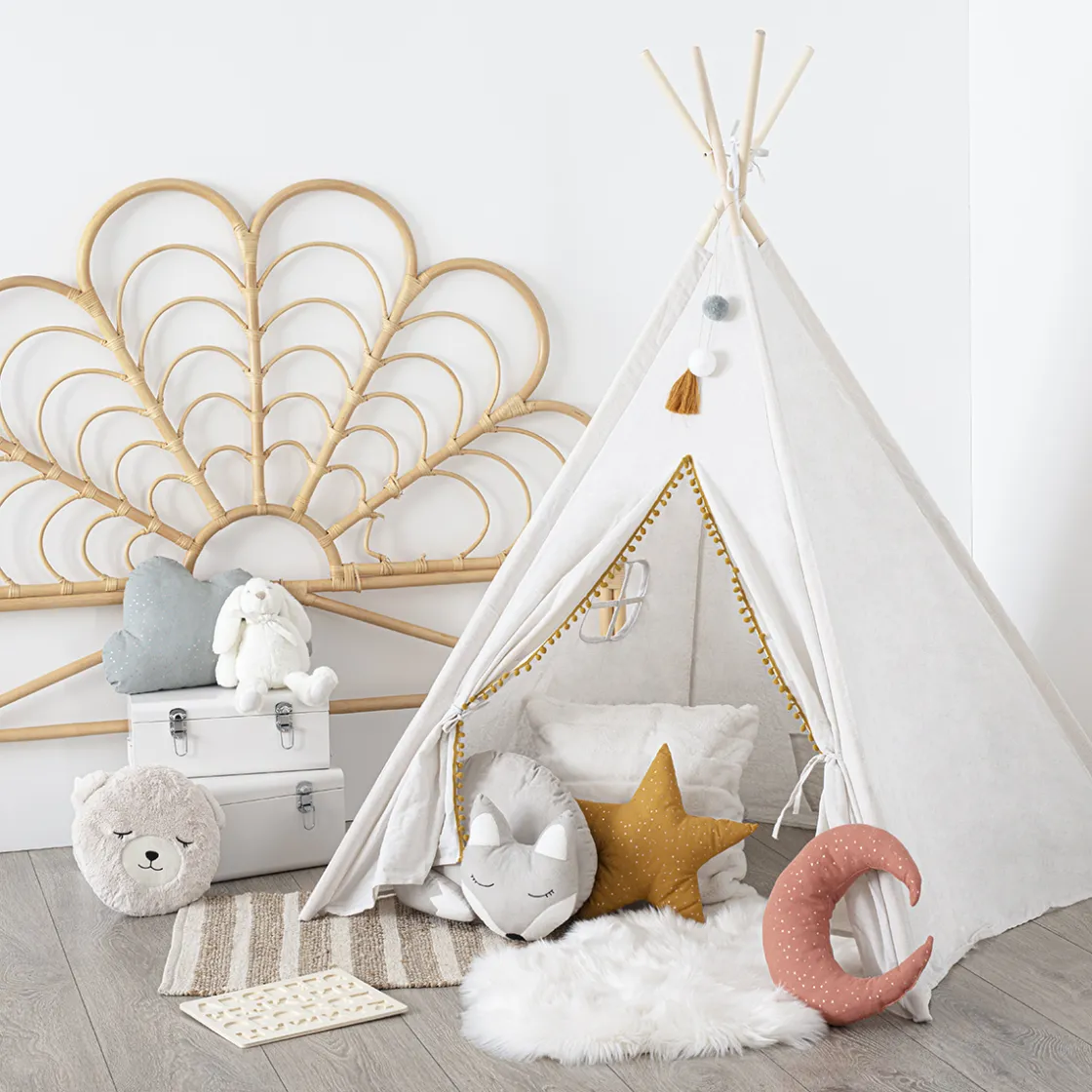 Avec sa structure en poteaux de peuplier et sa toile en tissu joliment bordée de pompons contrastés, ce tipi deviendra vite un élément phare d’une déco. Il est muni d’une petite fenêtre et d’une ouverture à l’avant qui peut se fermer grâce à des cordelettes: un véritable petit refuge propice à la rêverie, à la sieste et aux jeux!