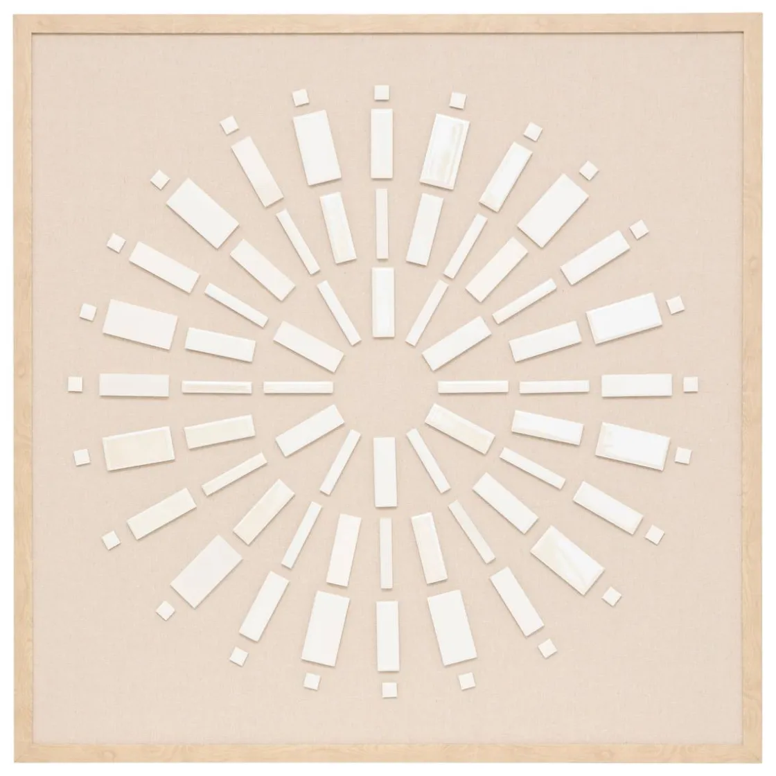 La toile en relief Houria arbore un tissu en lin qui valorise des motifs en céramique qui forment comme un soleil. Le tout est sublimé par un cadre en bois certifié FSC®. Cette toile carré donnera vie à un séjour accrochée au-dessus d’une console en bois ou en rotin Atmosphera.
