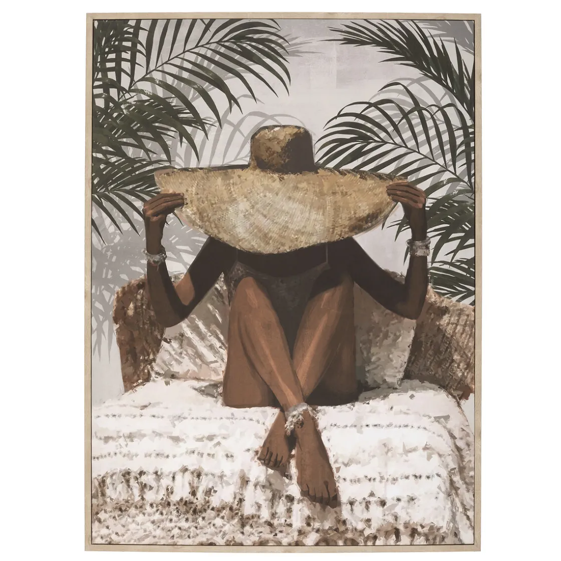 La toile imprimée « Eliane » est montée sur un panneau de bois rectangulaire grand format et représente une femme à chapeau de paille, entourée de plantes tropicales. Une scène de farniente qui vous permettra de vous évader dans votre salon! Elle se mariera parfaitement avec des matières naturelles.