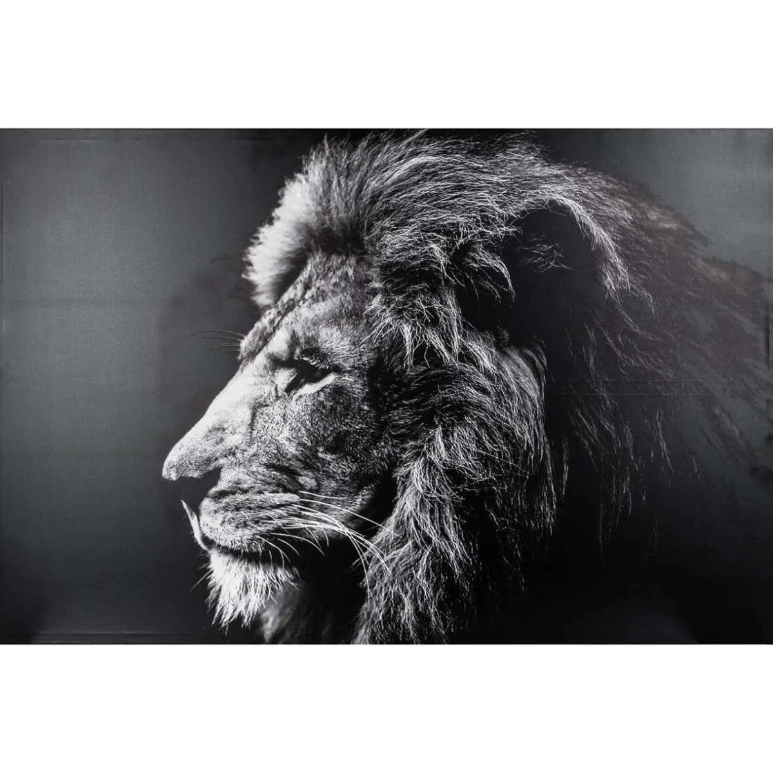 Ce portrait de lion doit son intensité aux contrastes noirs et blancs et à sa grande taille. Munie d’une structure en bois, cette toile rectangulaire rend hommage à la photographie animalière.