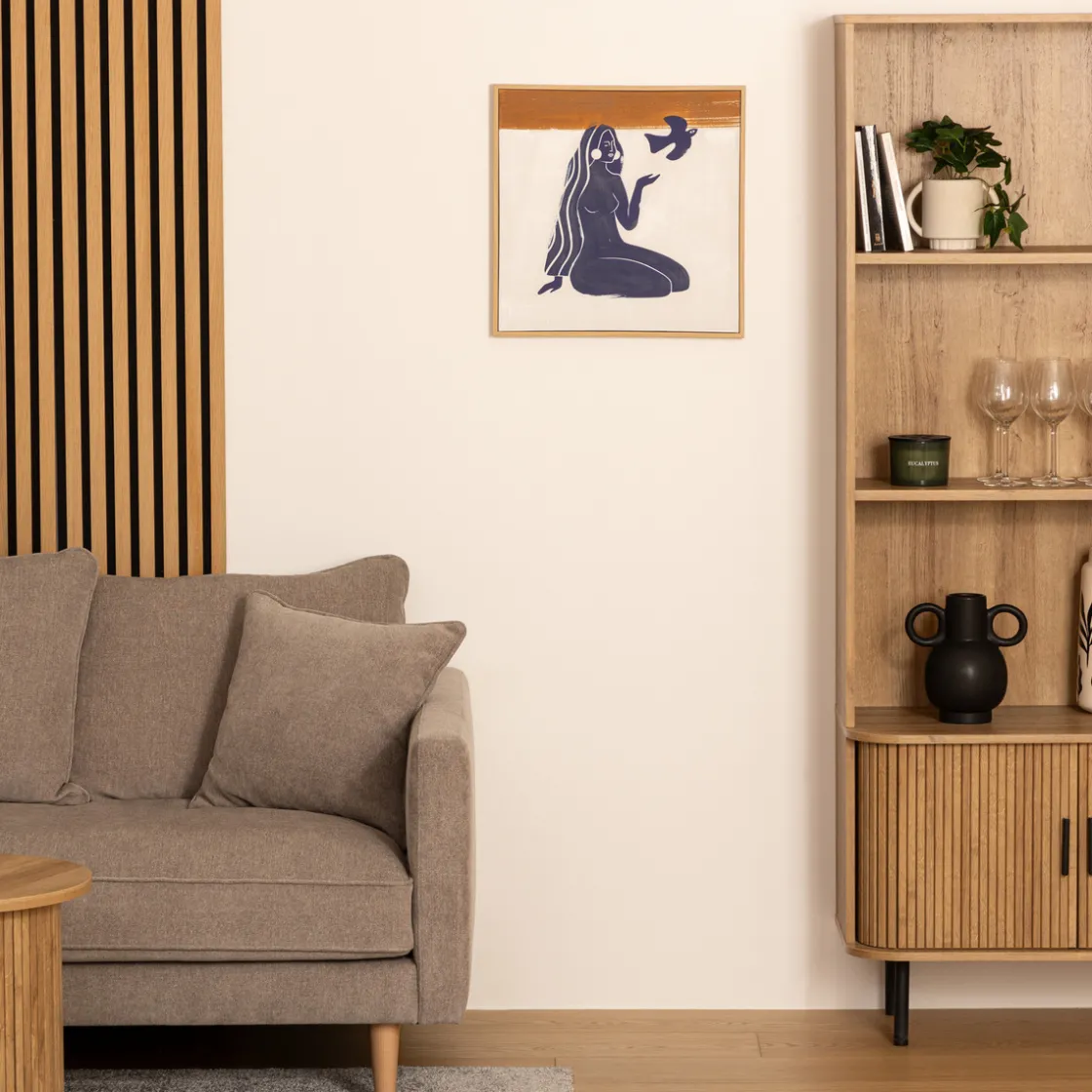 Fixez votre toile imprimée « Melody » au-dessus d’une commode en bois Atmospheraaux lignes scandinaves et profitez d’un univers cosy!
