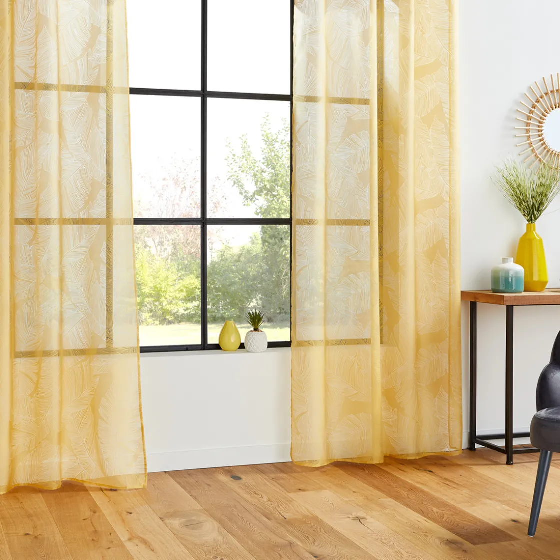 Le voilage « Devo » se caractérise par ses grands motifs en forme de feuilles qui décoreront à merveille une pièce à vivre. En plus de laisser passer la lumière, il vous protègera des regards extérieurs. Les oeillets en métal sont très pratiques pour l’installer rapidement sur une tringle à rideaux.