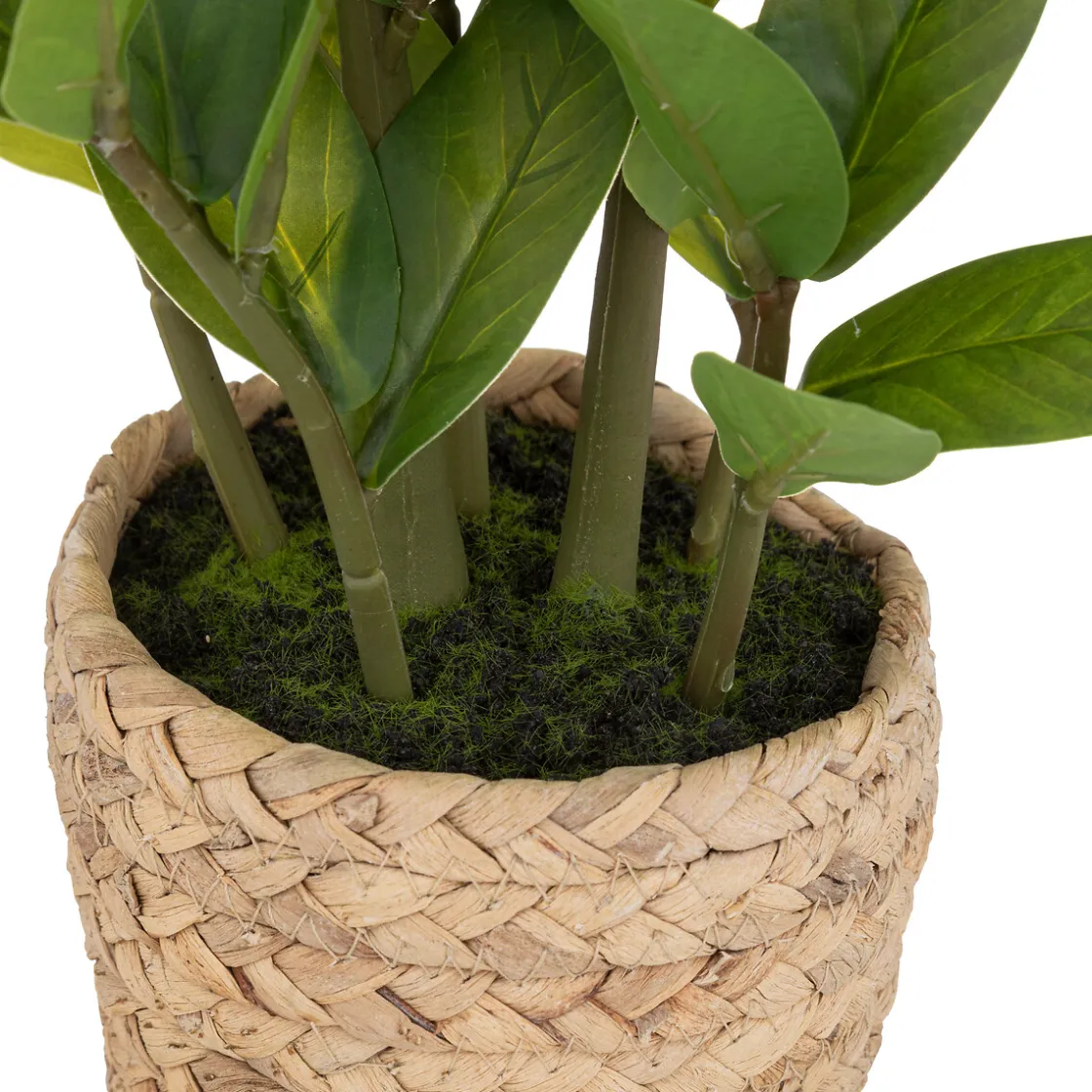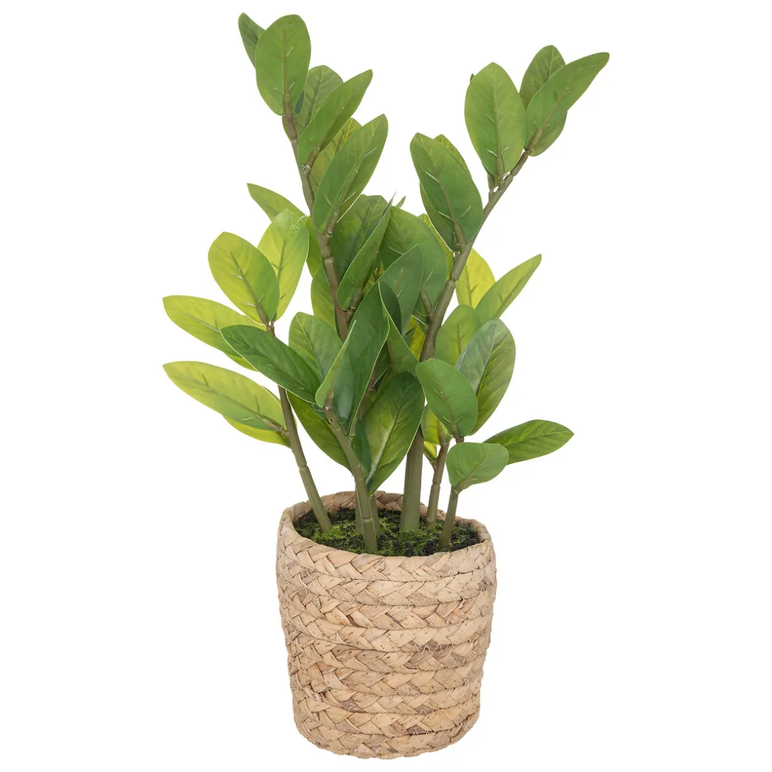 Ce zamio artificiel imité son modèle à la perfection! De format moyen, il trouvera sa place au sol comme sur un meuble ou une étagère. Installé dans un pot en ciment revêtu d’un tressage imitant la jacinthe d’eau, ce zamio offre des feuilles réalistes et son pied est couvert de mousse séchée.