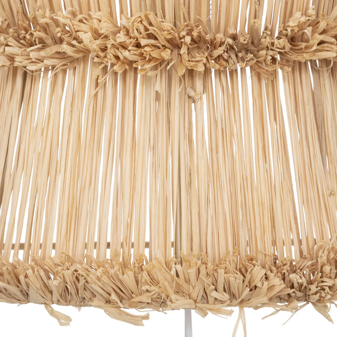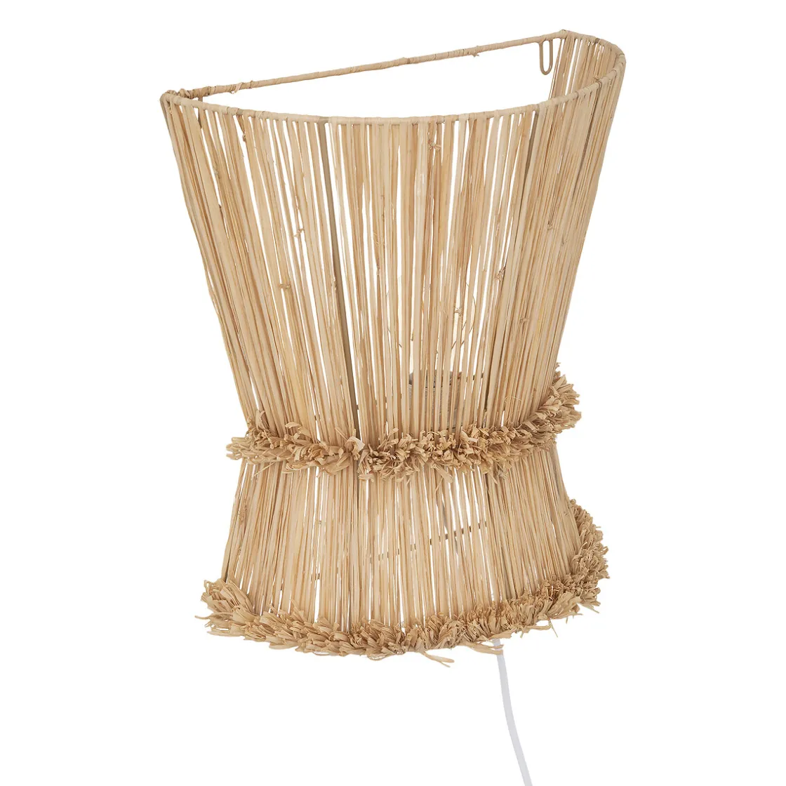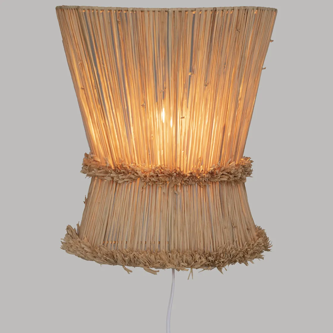 Réalisée à partir d’une structure en métal, l’applique « Loa » est entièrement habillée de raphia tressé et coupé à bord franc de manière à créer des franges. Elle diffusera une lumière tamisée à travers les tiges de raphia.
